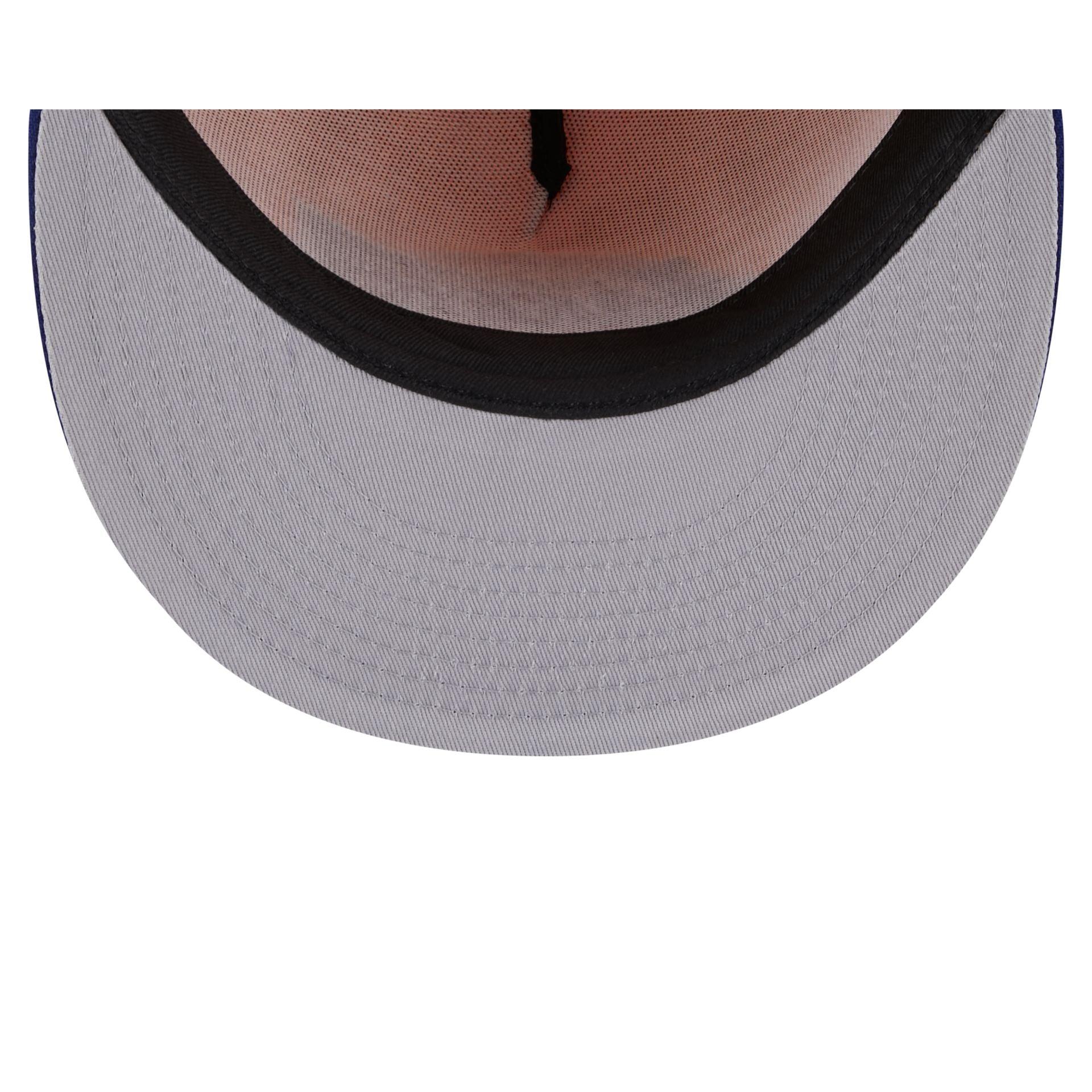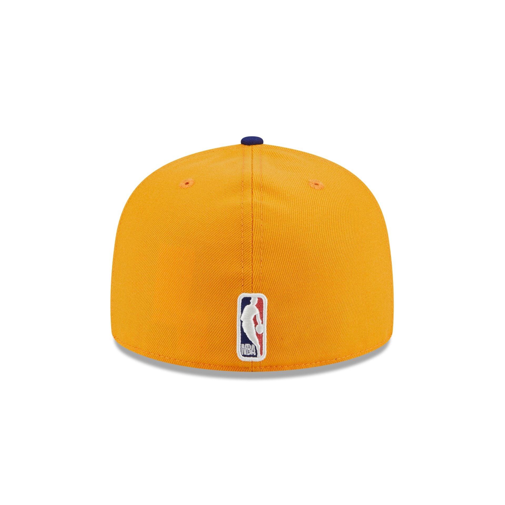 The Los Angeles Lakers Gold 59FIFTY A-Frame Fitted Cap features an embroidered Lakers logo at the front panels with a matching NBA Logoman at the rear. Additional details include a NBA Logoman patch at the right-wear side, a blue ink visor, and a gray undervisor.