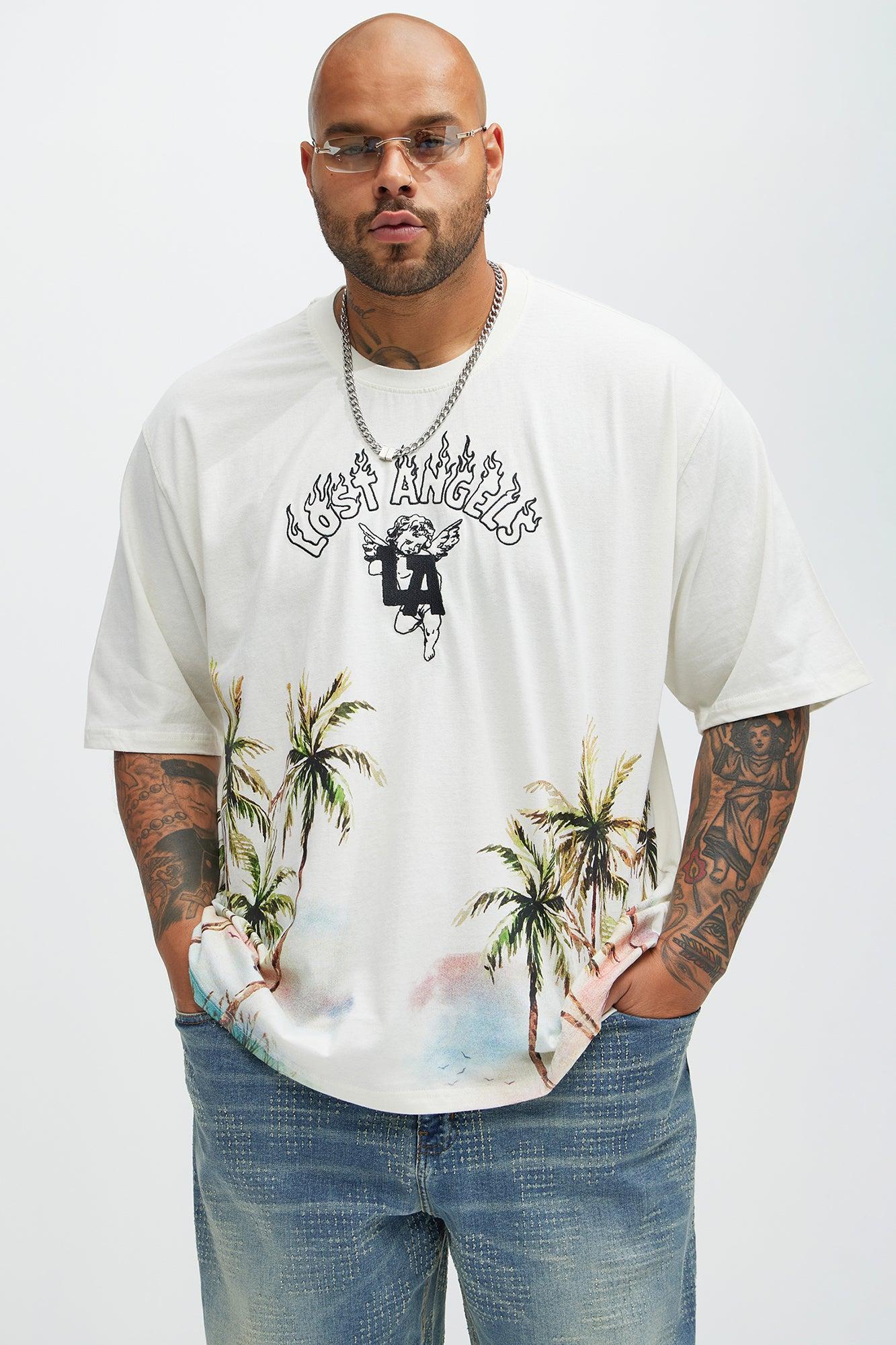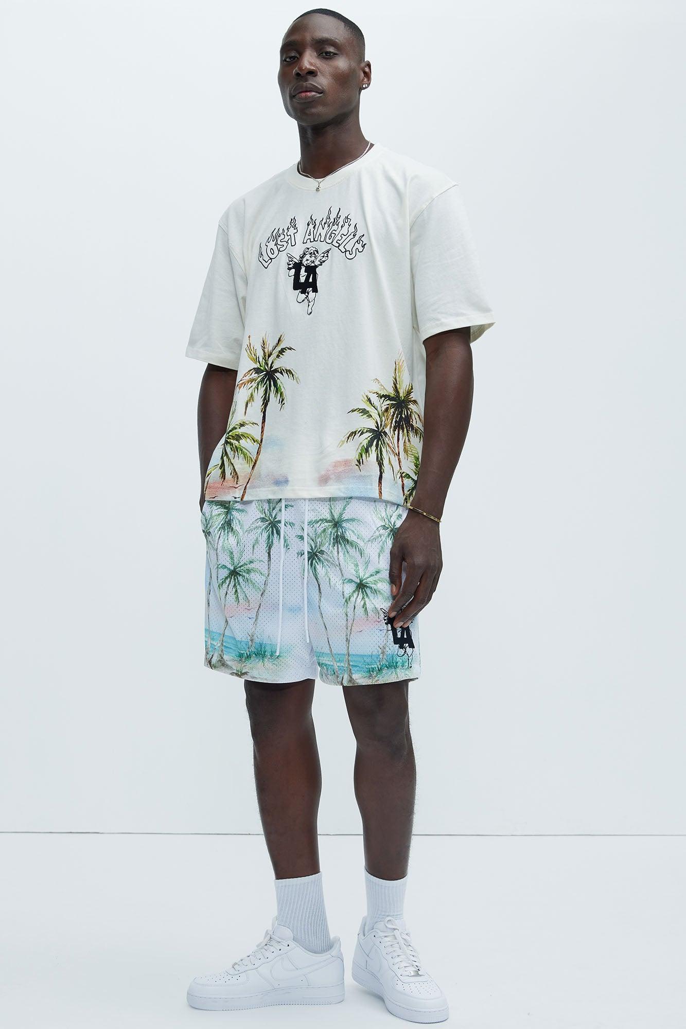 Available In Off White. Crew Neck Short Sleeve Screen Print Pair With "Lost Angeles Paradise Mesh Shorts" Disclaimer : Embroidery Placement Will Vary. 100% Cotton Imported