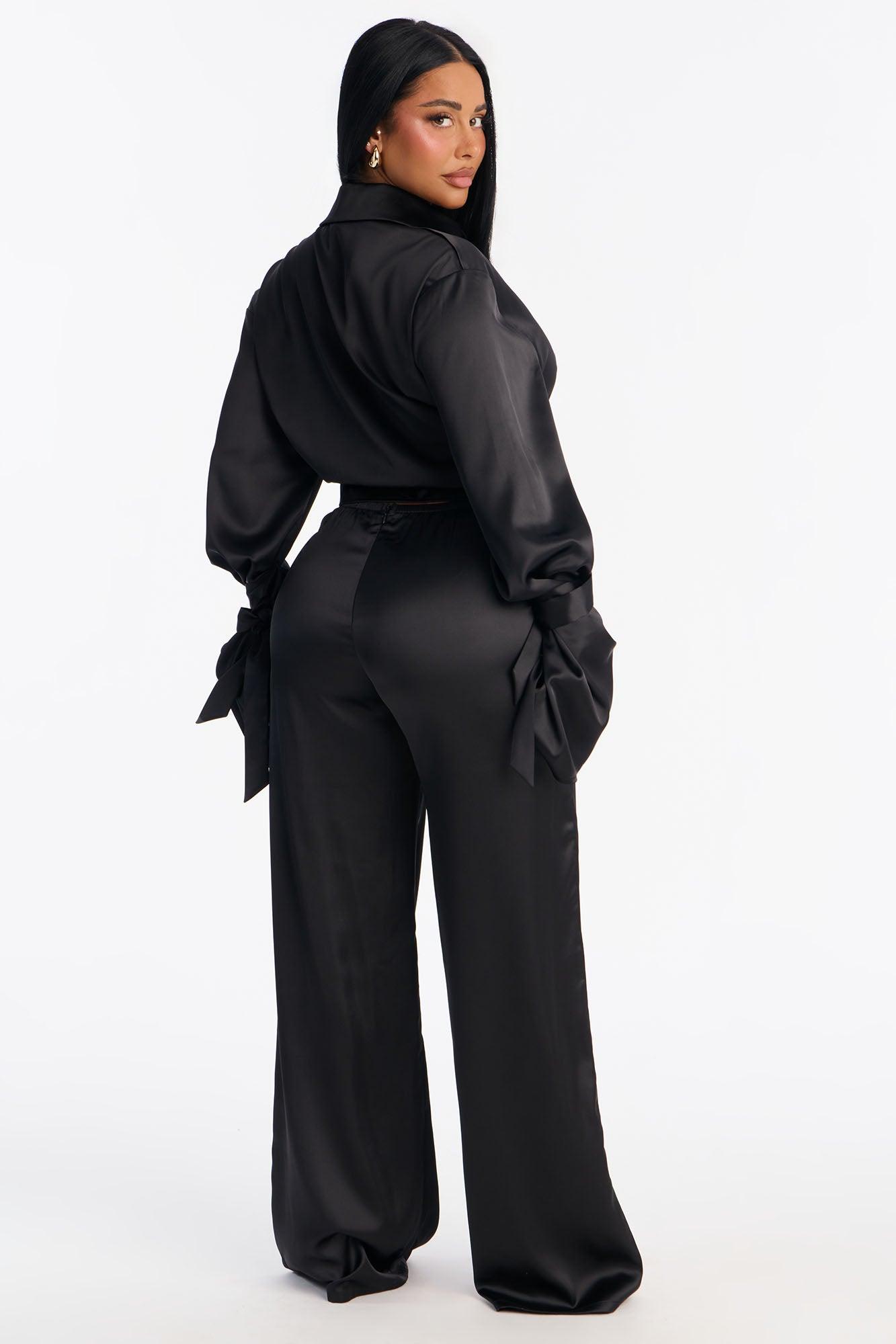 Available In Black. 2 Piece Ensemble Blouse And Wide Leg Pant Set Stretch 34" Inseam Elastic Waistband Invisible Back Zipper Pant Closure Top & Bottom: Self: 96% Polyester 4% Spandex Imported California Proposition 65WARNING: Cancer and Reproductive Harm - www.P65Warnings.ca.gov.
