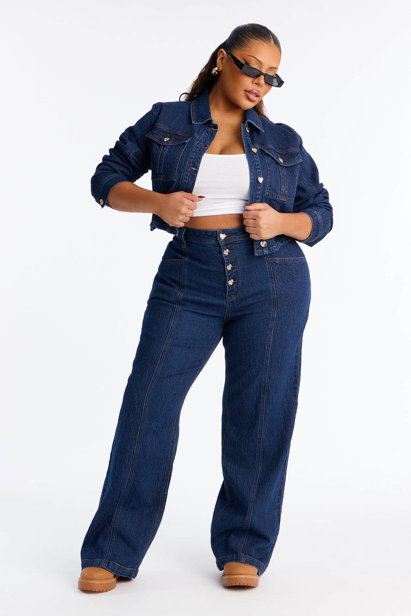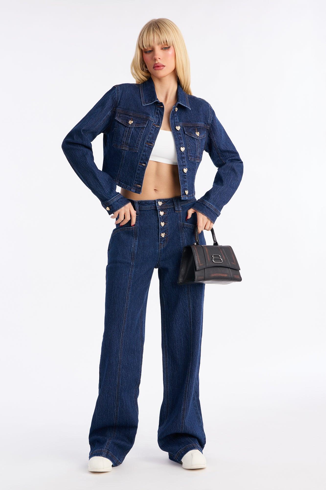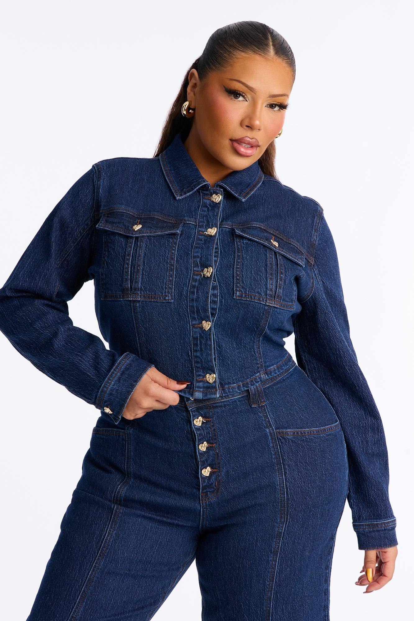 Available In Dark Wash. Pair With Lost In Love Stretch Straight Leg Jean Denim Jacket Collar Functional Pockets Heart Button Closure Cropped Denim Stretch Disclaimer: Due To The Specialized Wash Process, Each Garment Is Unique. 99% Cotton 1% Spandex Imported California Proposition 65WARNING: Cancer and Reproductive Harm - www.P65Warnings.ca.gov.