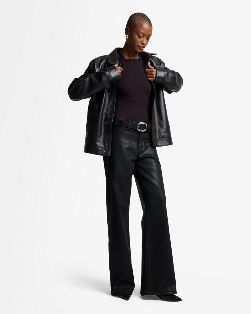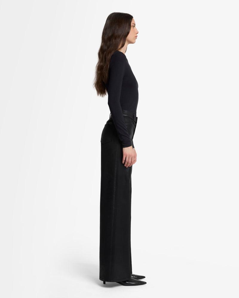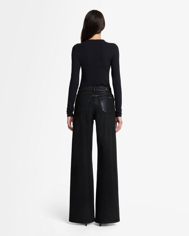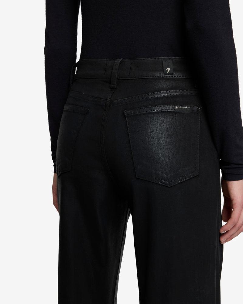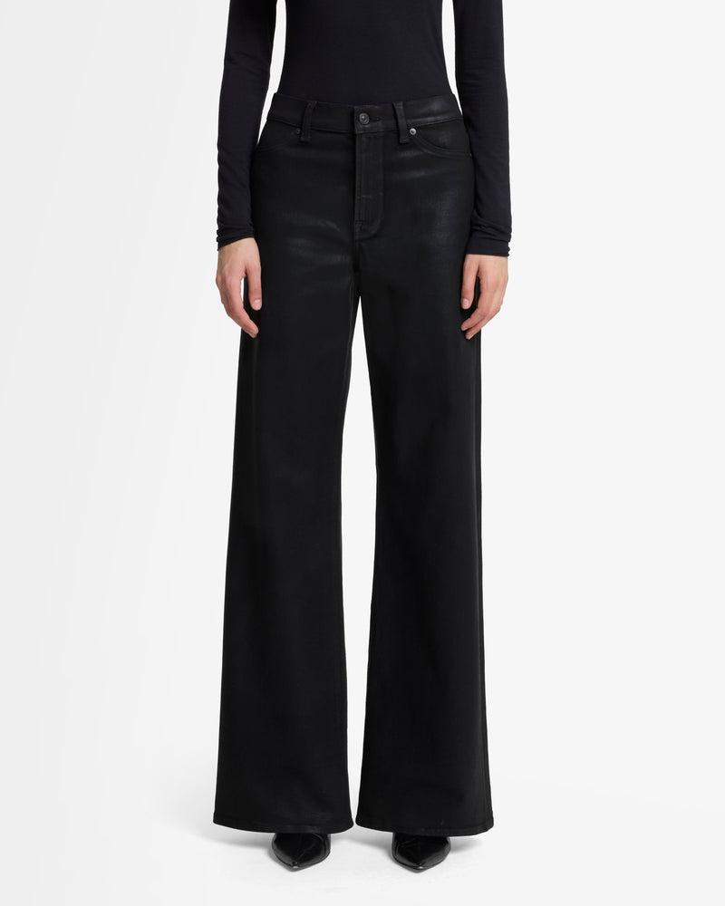 Fits like: A high rise fit that contours the waist and hips before falling into an easy, full-length wide leg. Feels like: The comfort and stretch of 7 denim with the look of leather. The Details: Black wash Coated denim Subtle sheen for a cool, elevated style Zip fly with button closure Clean back pocket