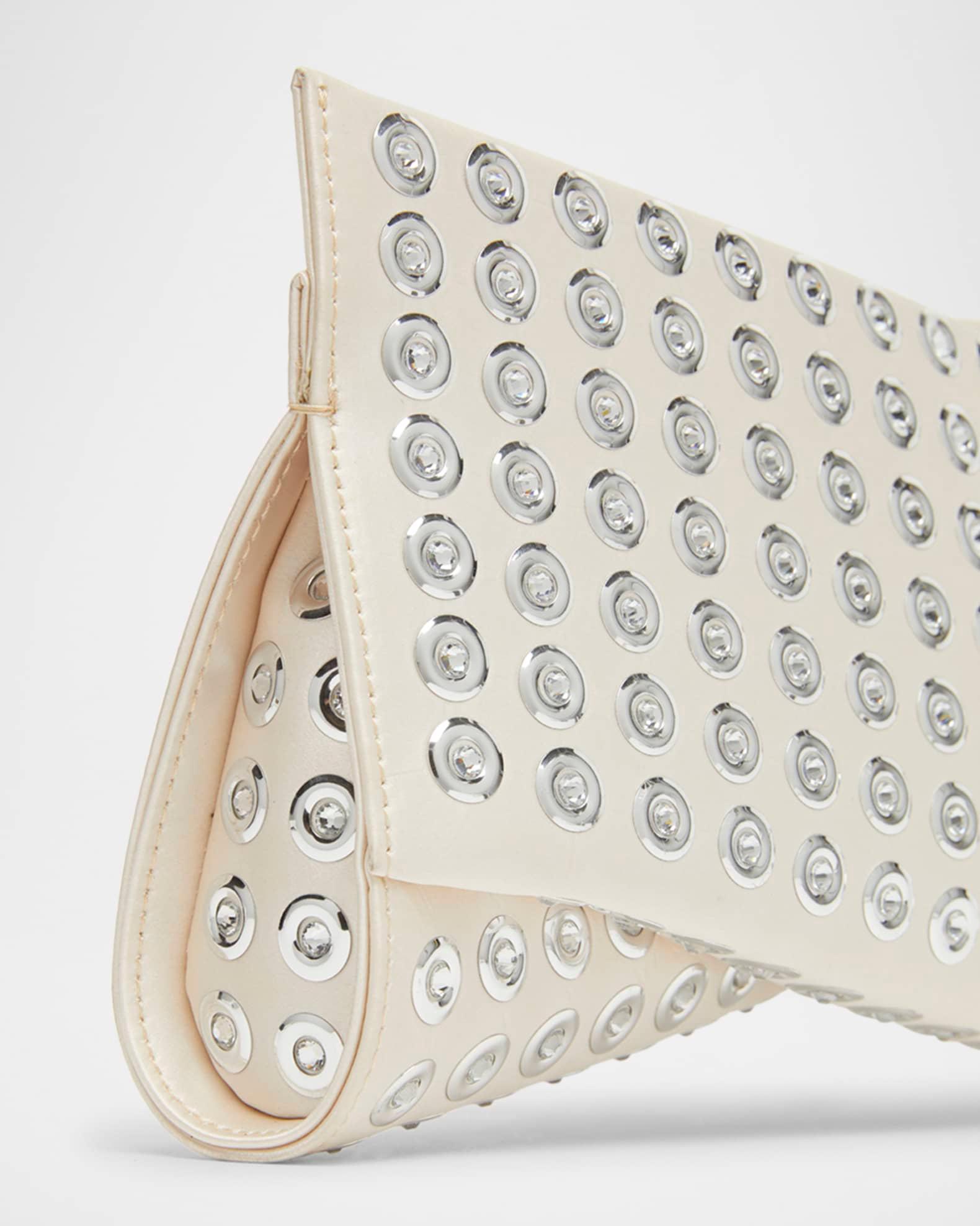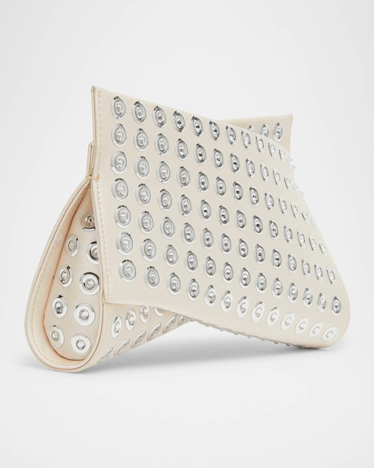 Christian Louboutin "Loubitwist" crepe satin clutch bag with boum mirror embellishment Detachable shoulder strap Can be worn as a clutch or shoulder bag Zip top closure Signature red lining Approx. 5.7"H x 10.2"W x 1.9"D Silk Made in Italy