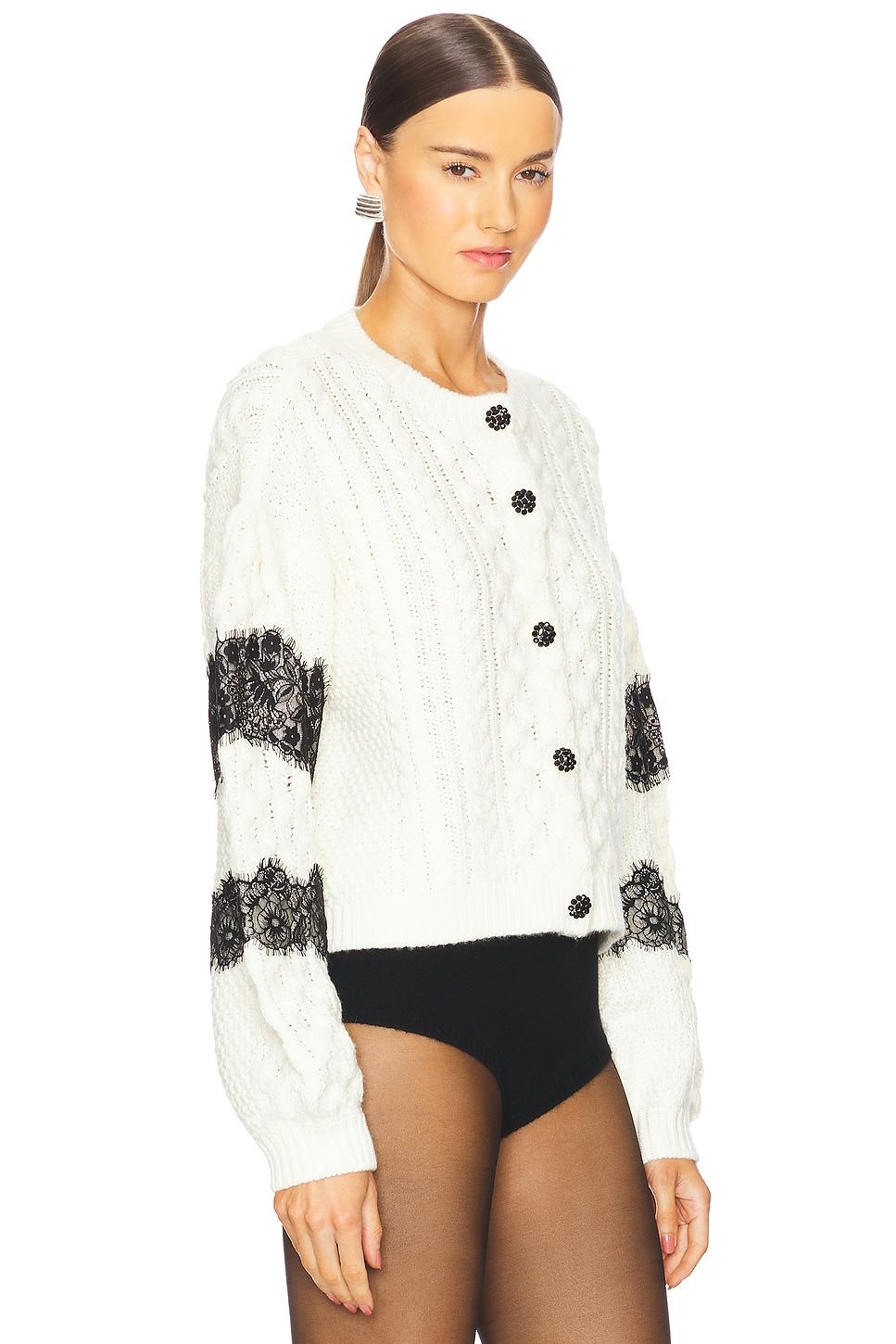 70% acrylic, 30% wool. Made in China. Machine wash. Front snap button closure. Open knit fabric with lace trim. Revolve Style No. CINR-WK45. Manufacturer Style No. ZK9938651Z.