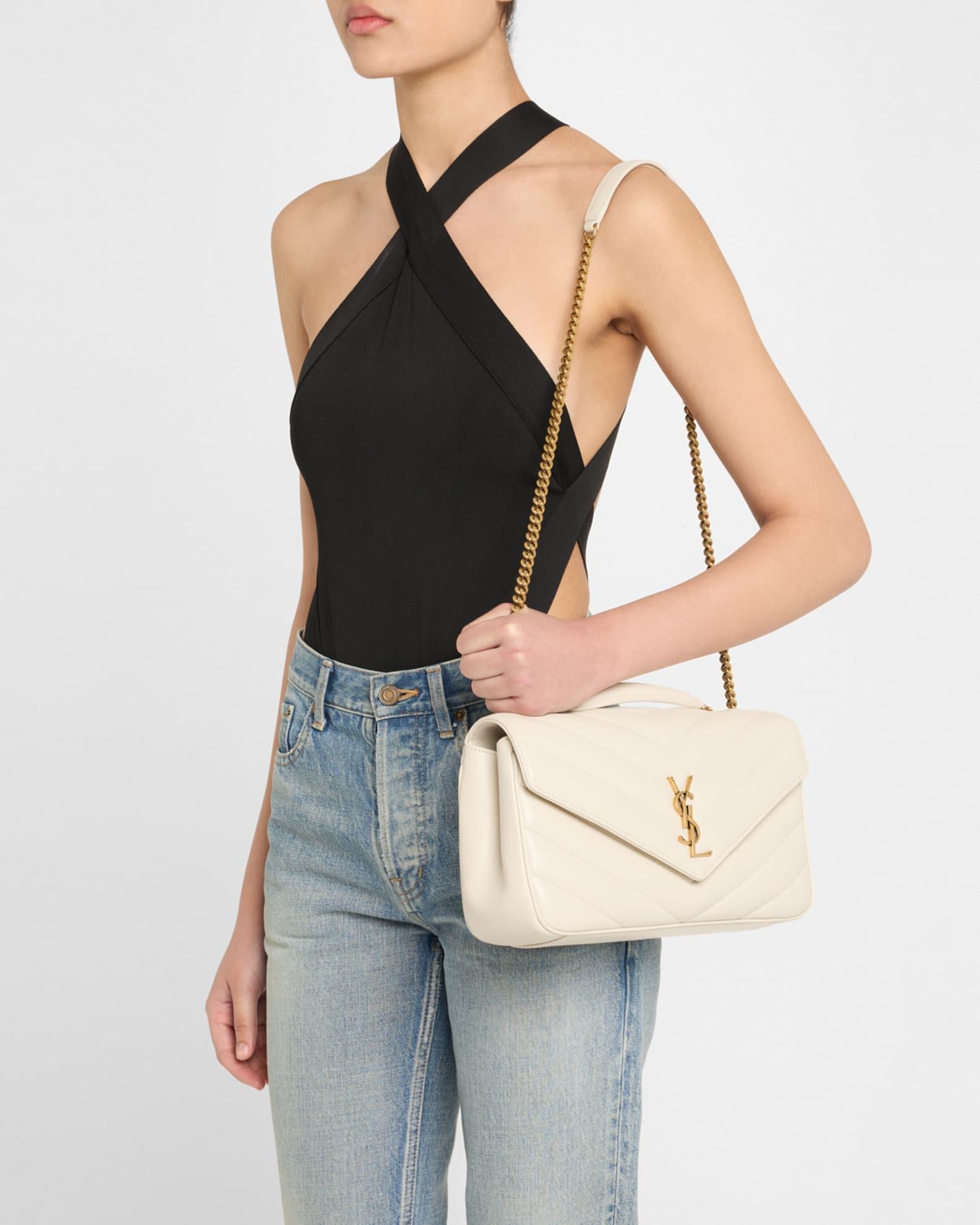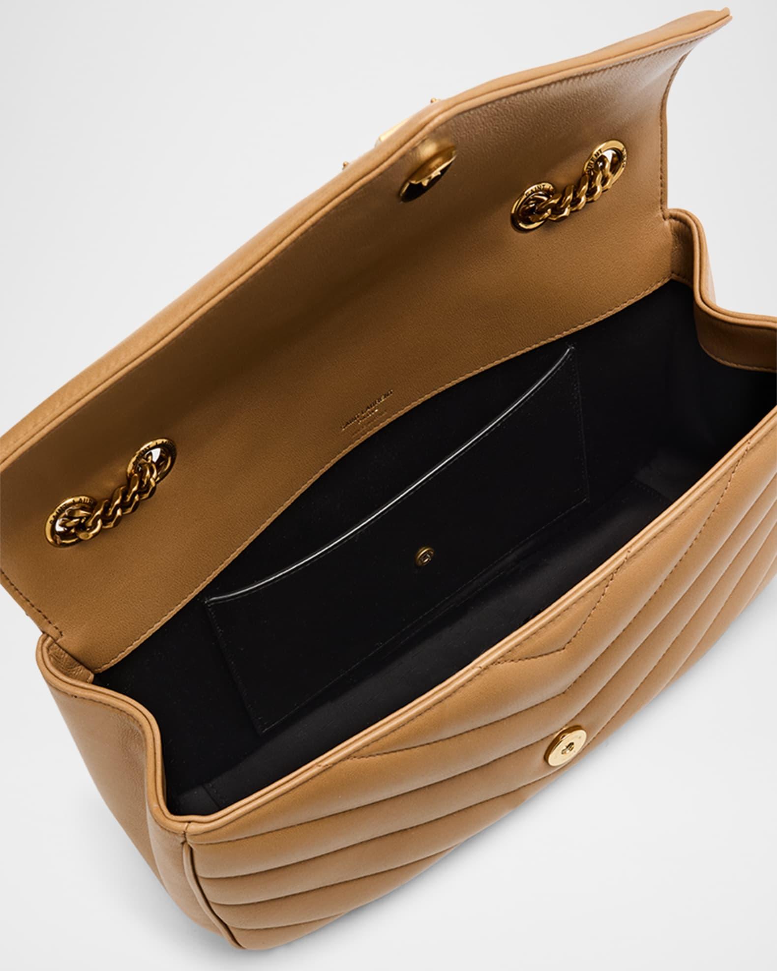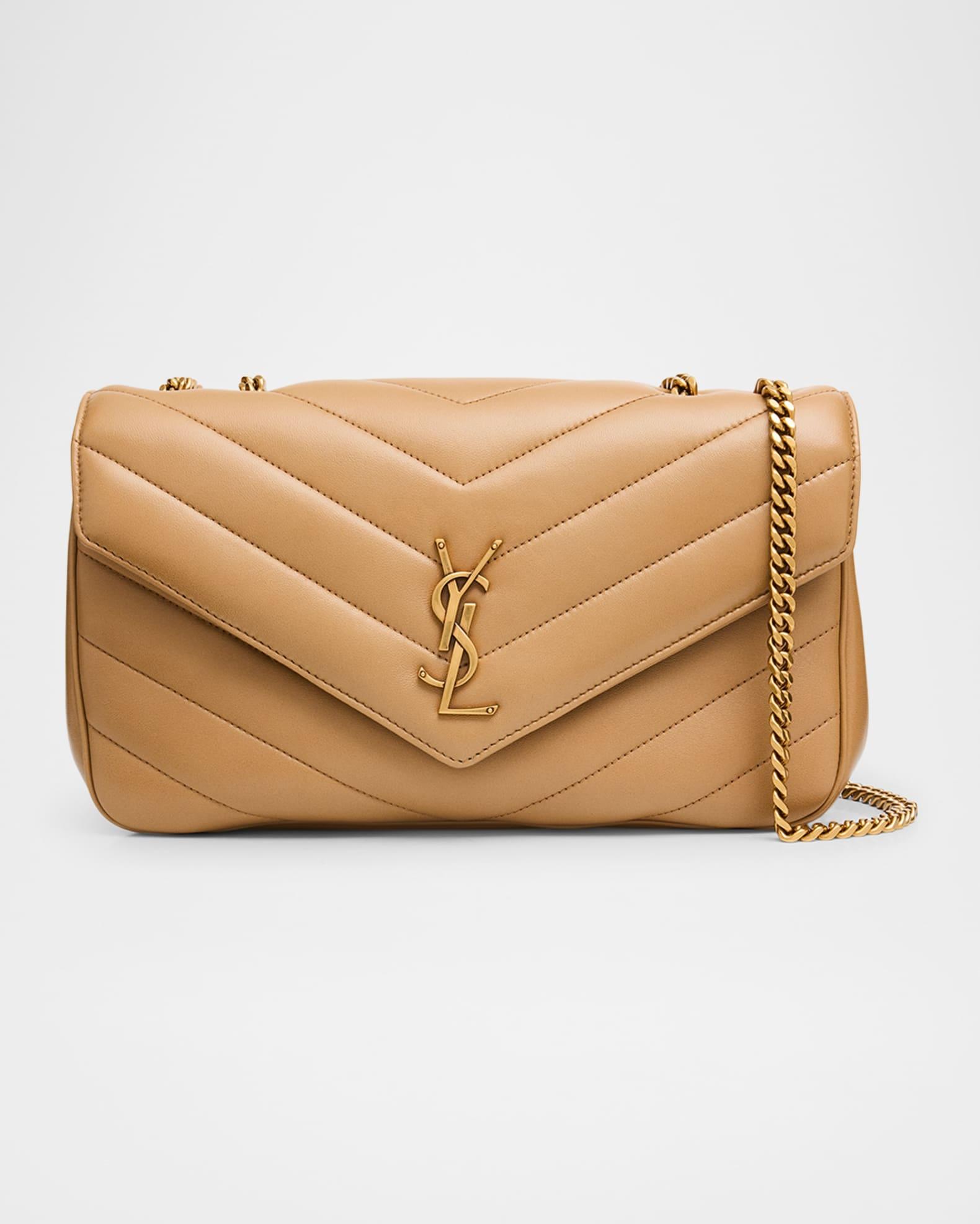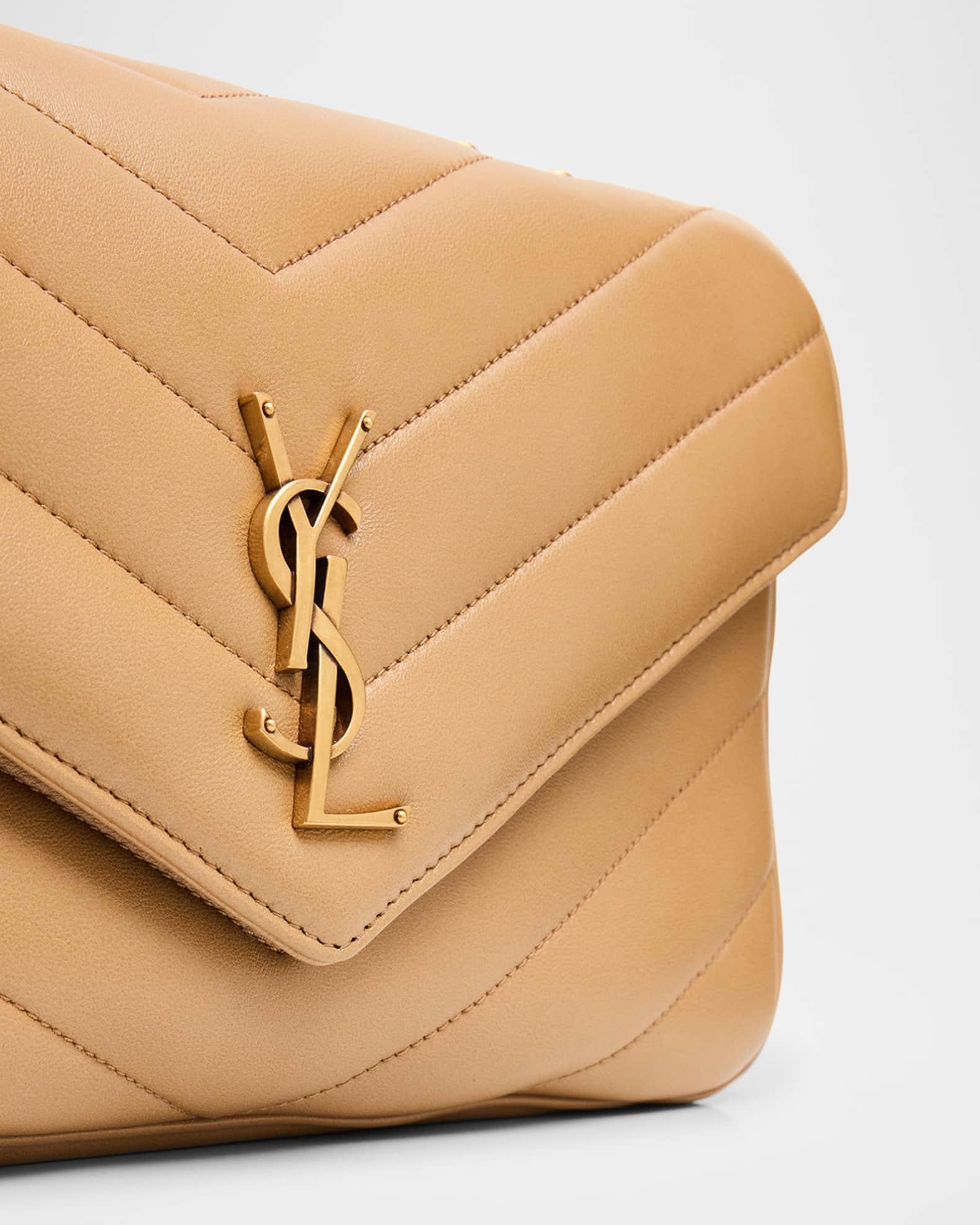 Saint Laurent "Loulou" Y-quilted calfskin shoulder bag. Detachable chain and leather shoulder strap can be worn single or doubled; 8.7"-17.7" drop Flap top with snap closure. Exterior, signature interlocking YSL logo Gold-tone hardware Interior flap pocket Includes removable pouch and pocket mirror Grosgrain lining Approx. 11.4"W x 6.7"H x 3.1"D Made in Italy. Proposition 65 warning for California residents