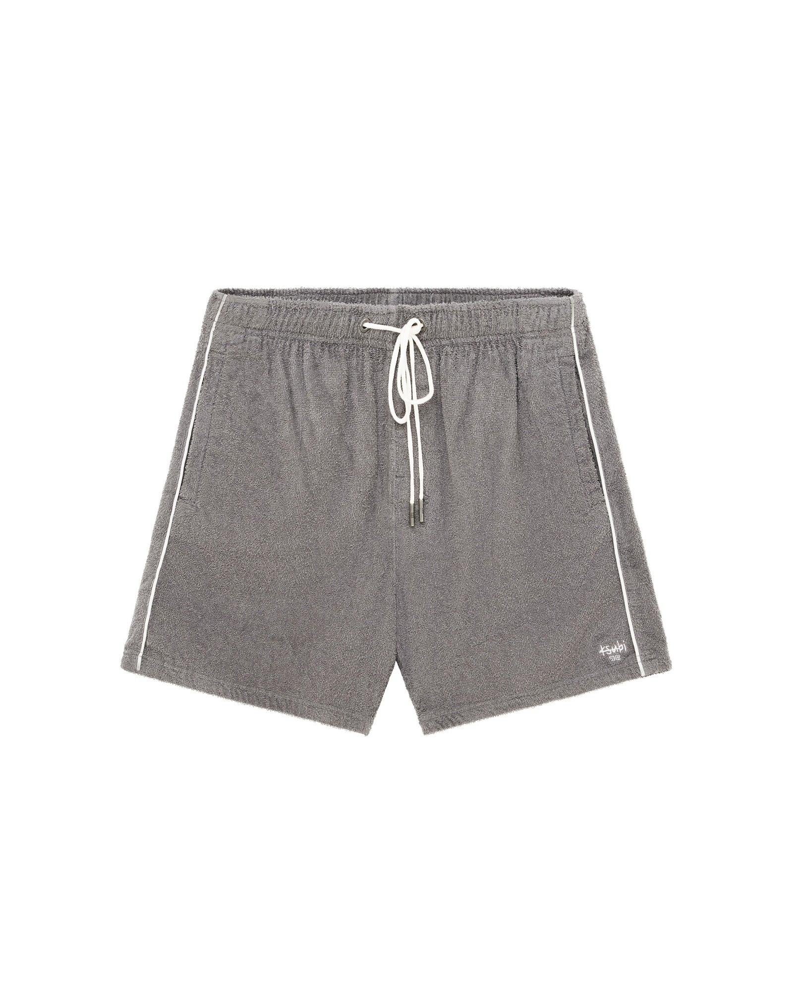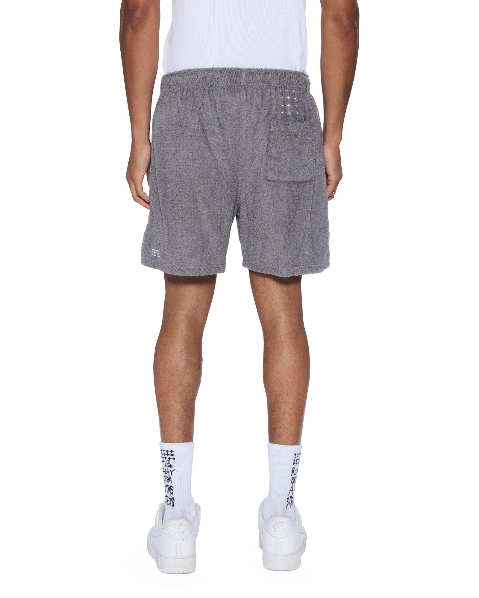 The Lounge Short Charcoal is a regular fit terry short with an elastic waistband and drawstrings. Made from a custom jacquarded Ksubi pattern in a navy colourway, it features cutaway pockets, a single back patch pocket, and Ksubi branded embroidery on the front left leg. Finished with T-box and 4x4 branding, and Ksubi branded hardware.