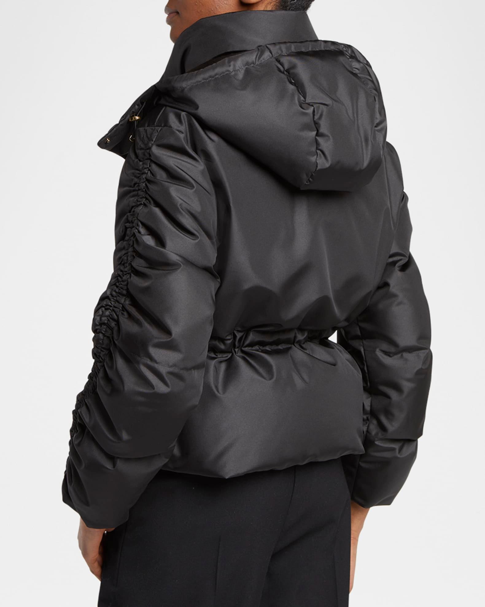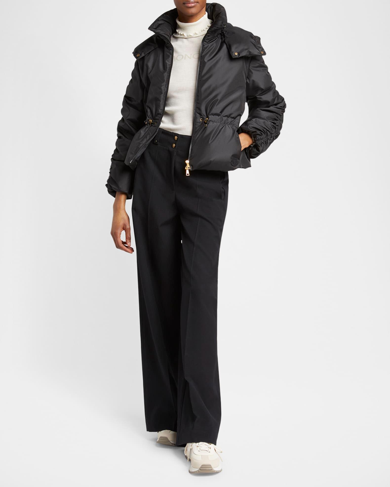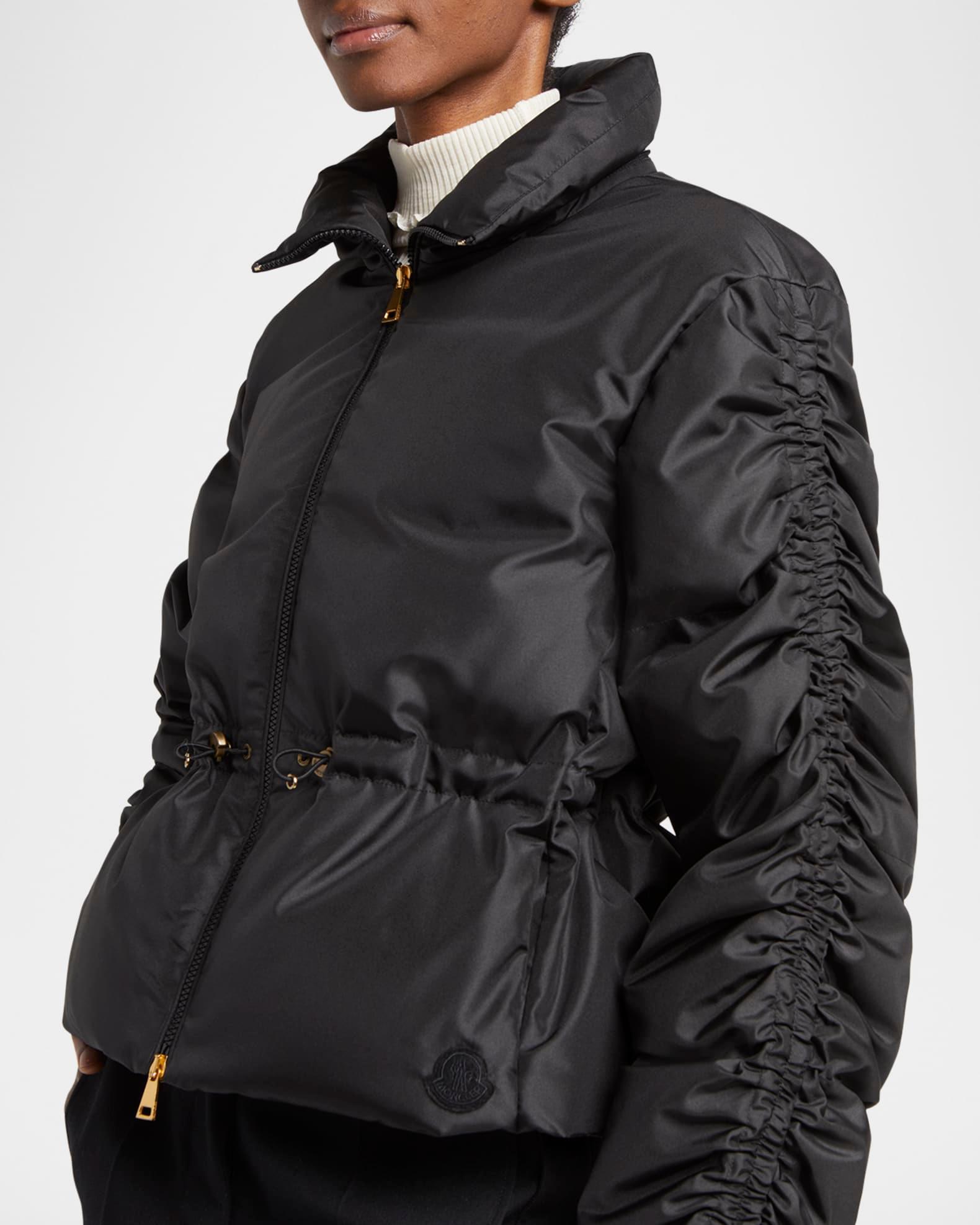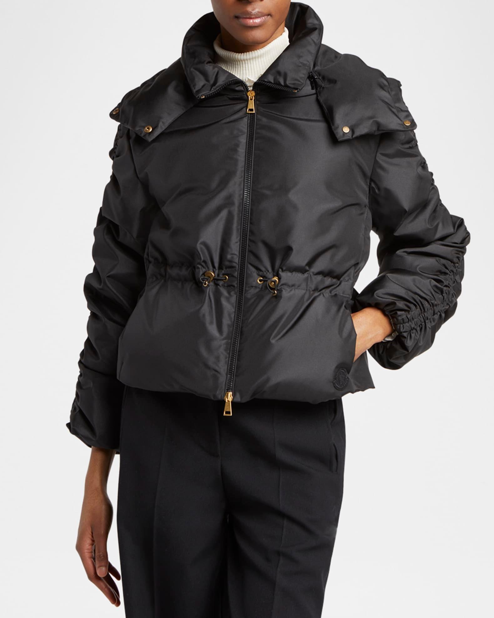 Moncler "Louviere" utility-inspired puffer jacket finished with gold-tone hardware for a touch of glamour Features a signature tonal logo patch on the left hem Detachable and adjustable hood Stand collar Long ruched sleeves Adjustable drawcord waist Side pockets Classic fit Two-way zip-front Polyester Lining: Polyester Fill: Down/feather Hand wash Imported