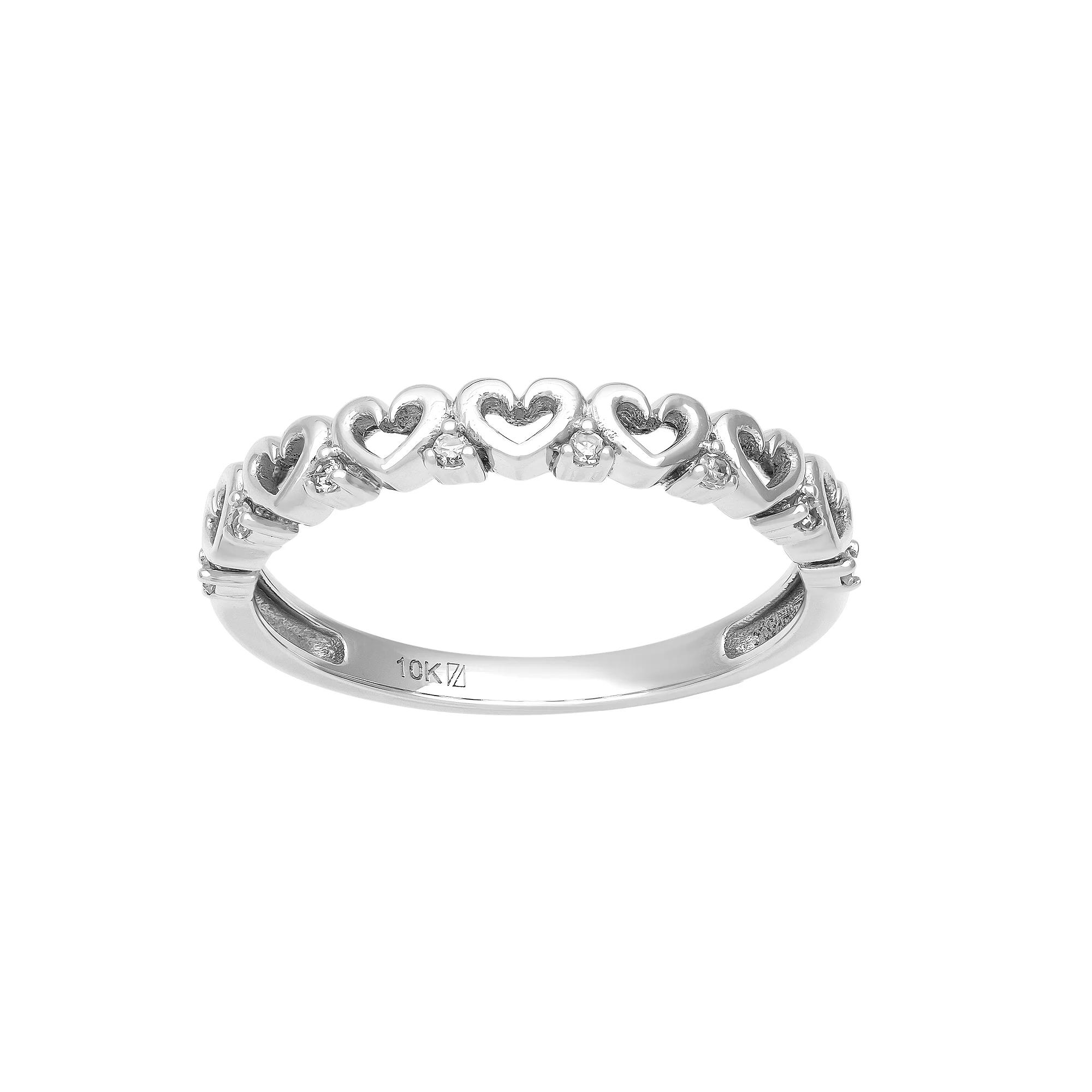 Designed with a repeating heart motif and adorned with diamond accents, this Love Always 10k white gold anniversary ring is a beautiful symbol of your undying love. Designed with a repeating heart motif and adorned with diamond accents, this Love Always 10k white gold anniversary ring is a beautiful symbol of your undying love. FEATURES Width: 3 mm Shank style: stackable Band fit: flat Metal: 10k white gold Plating: rhodium Finish: polished Packaging: boxedDIAMOND DETAILS Total weight: less than 1/10 ct. Color grade: I-J Clarity: I3 Shape: round Setting: prong Gemstones may have been treated to enhance their appearance. Special care may be required. Please visit our Gemstone Treatment & Special Care Guide for more information. Diamond weights are approximate. Diamond Total Weights may vary between .01 and .13 ct. Some diamonds consist of fewer than 17 facets. Image(s) may be enlarged to show detail. Please note, due to the high value of this item, a signature may be required upon delivery. Size: 5. Gender: female. Age Group: adult.