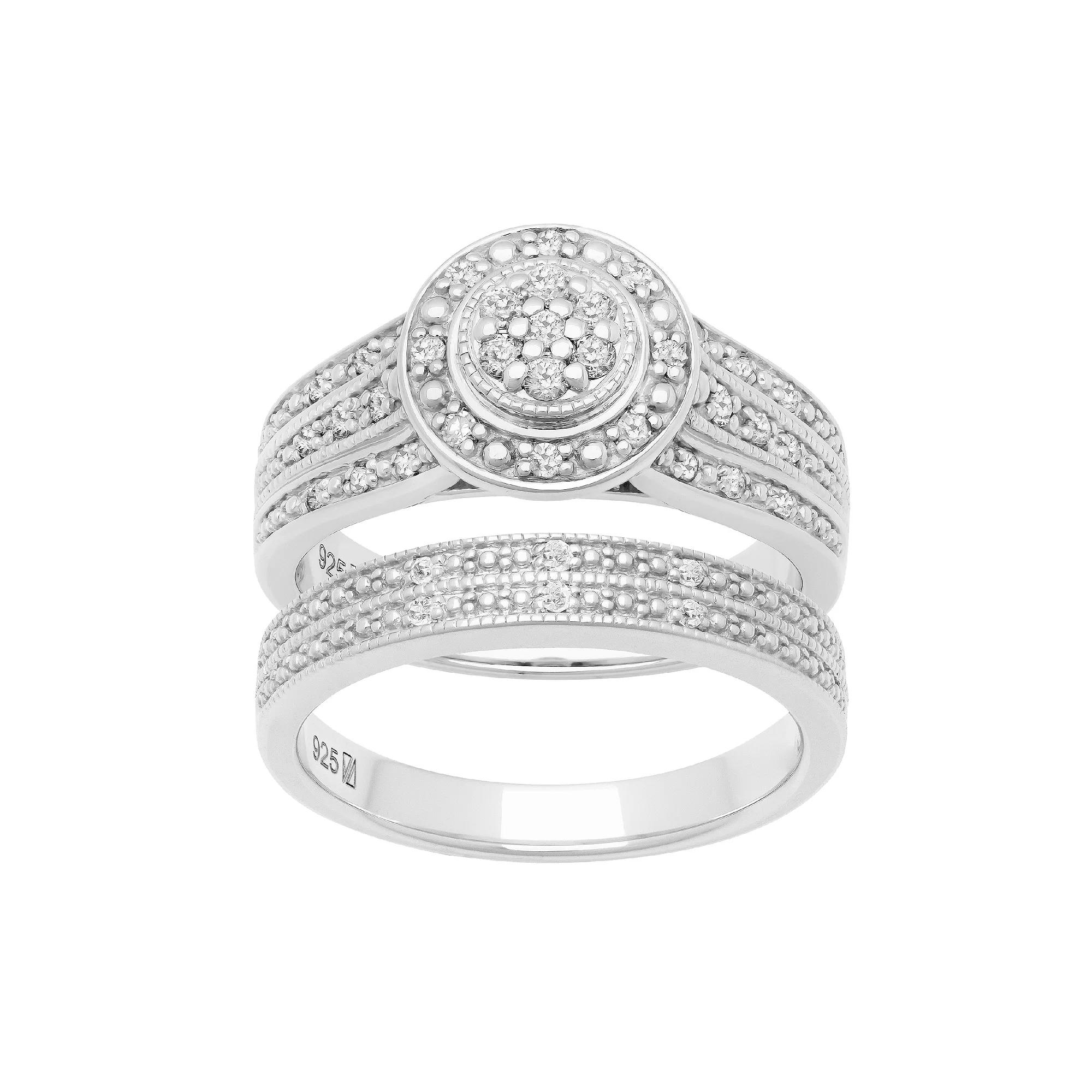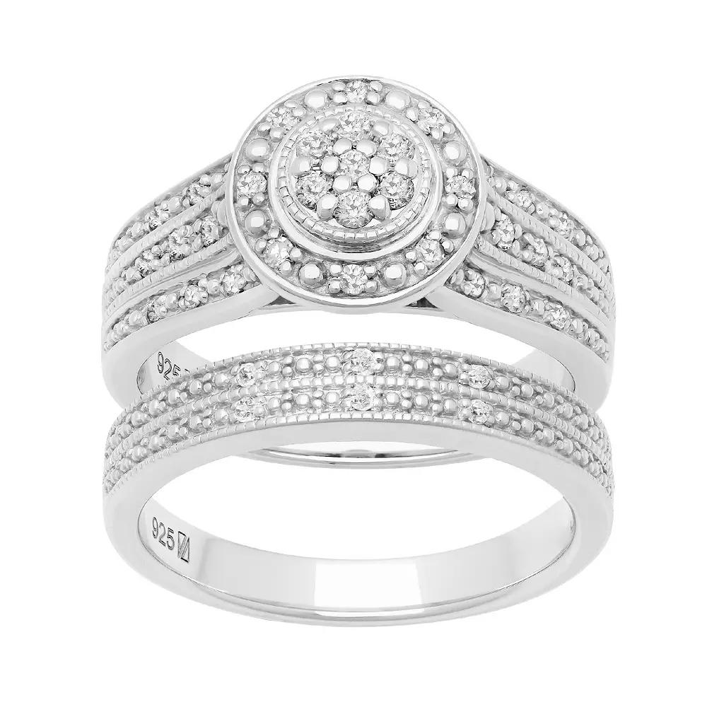 This sterling silver diamond halo bridal set is a beautiful symbol of your love and never-ending commitment. This sterling silver diamond halo bridal set is a beautiful symbol of your love and never-ending commitment. Includes: engagement ring & wedding band Width: 14 mm Metal: sterling silver Plating: rhodium Finish: polished Packaging: boxedDIAMOND DETAILS Total weight: 1/3 ct. Shape: round Setting: prong Diamond weights are approximate. Diamond Total Weights may vary between .01 and .13 ct. Some diamonds consist of fewer than 17 facets. Gemstones may have been treated to enhance their appearance. Special care may be required. Please visit our Gemstone Treatment & Special Care Guide for more information. Image(s) may be enlarged to show detail. Please note, due to the high value of this item, a signature may be required upon delivery. Size: 8. Color: White. Gender: female. Age Group: adult.