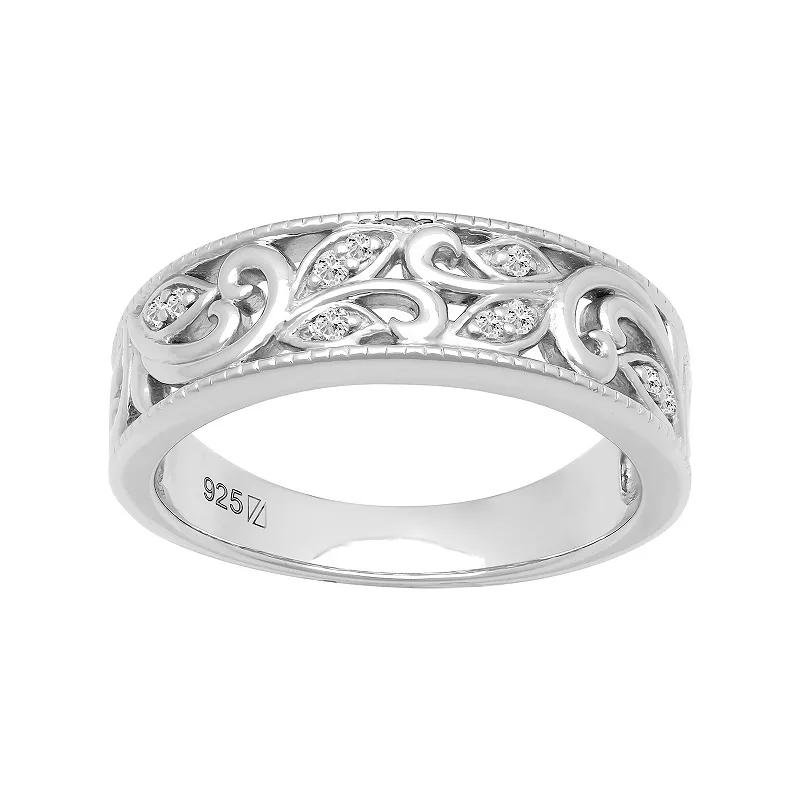 Showcase your never-ending love for one another with this sterling silver diamond accent vine anniversary ring. Showcase your never-ending love for one another with this sterling silver diamond accent vine anniversary ring. FEATURES Width: 6 mm Shank style: anniversary Band fit: flat Metal: sterling silver Plating: rhodium Finish: milgrain Packaging: boxedDIAMOND DETAILS Total weight: less than 1/10 ct. Color grade: I-J Clarity: I3 Shape: round Setting: prong Gemstones may have been treated to enhance their appearance. Special care may be required. Please visit our Gemstone Treatment & Special Care Guide for more information. Diamond weights are approximate. Diamond Total Weights may vary between .01 and .13 ct. Some diamonds consist of fewer than 17 facets. Image(s) may be enlarged to show detail. Please note, due to the high value of this item, a signature may be required upon delivery. Size: 5. Color: White. Gender: female. Age Group: adult.