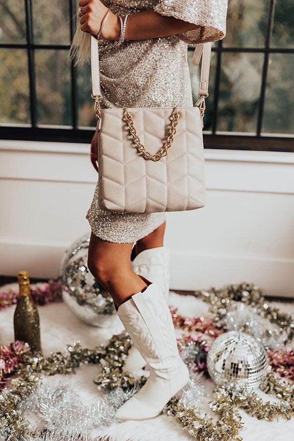 Take your handbag collection to the next level with our luxe birch colored 'Love And Luck' crossbody featuring sleek faux leather material with diagonal quilted texturing, two gold chain link handles, a removable and adjustable shoulder strap, and a spacious fully lined interior with an additional inside zip closure!