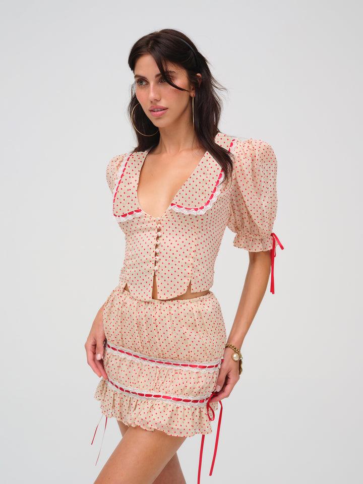 Inspired by nostalgic ‘50s and ‘60s silhouettes, the Love Dot puff sleeve top charms with its vintage-inspired red polka dot print and wide collar. Adorned with slotted ribbon lace trim throughout, this collared blouse features functional center-front buttons and a flirty notched hem.