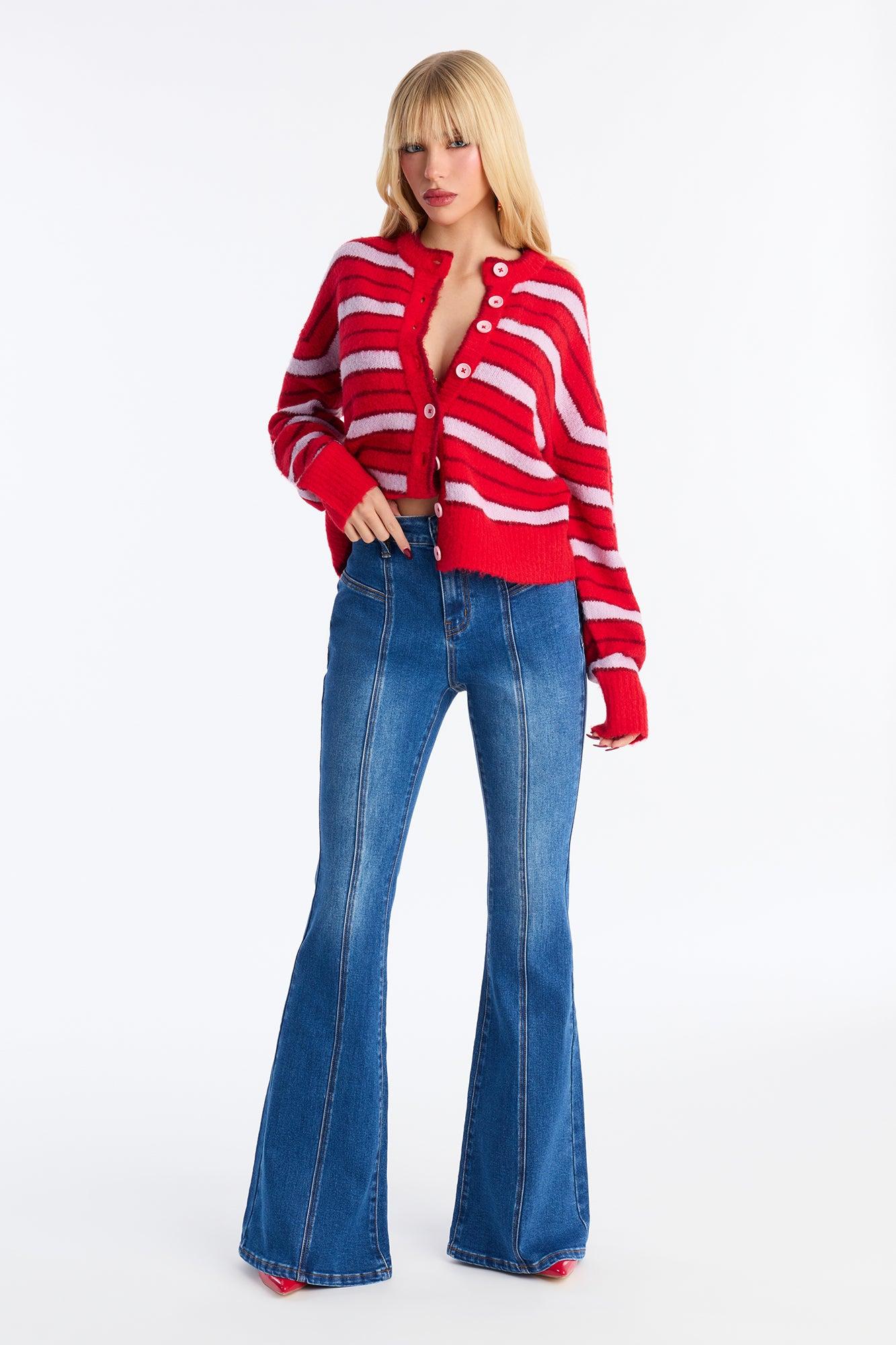 Available In Dark Wash. Flare Leg Jean Non Functional Front Pockets Heart Detail 10.5" Rise 34" Inseam Medium Stretch Disclaimer: Due To The Specialized Wash, Each Garment Is Unique. 93% Cotton 5.5% Polyester 1.5% Spandex Imported California Proposition 65WARNING: Cancer and Reproductive Harm - www.P65Warnings.ca.gov.