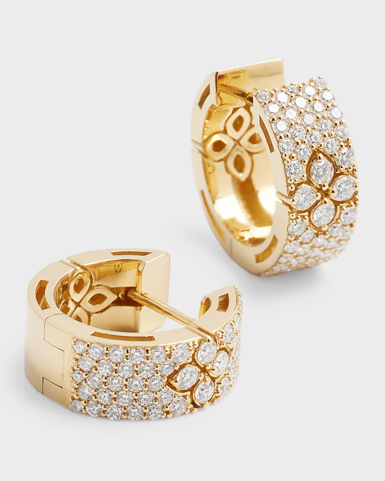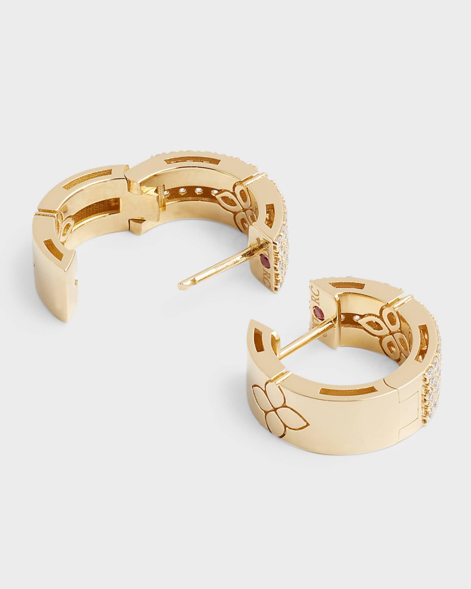 Roberto Coin huggie earrings. 18-karat yellow gold hardware. White diamond pave and flowers. Approx. 0.6" diameter; 5mm wide. 0.95 total diamond carat weight. Signature hidden ruby. Lever backs for pierced ears. Handcrafted in Italy.