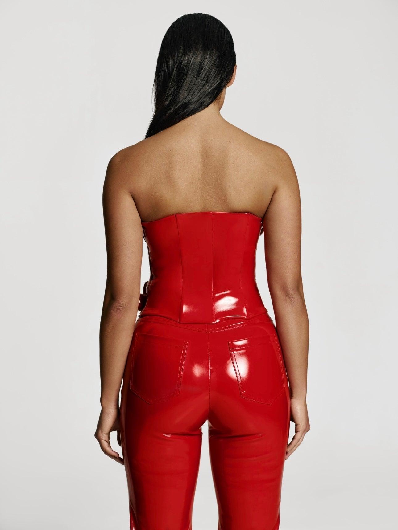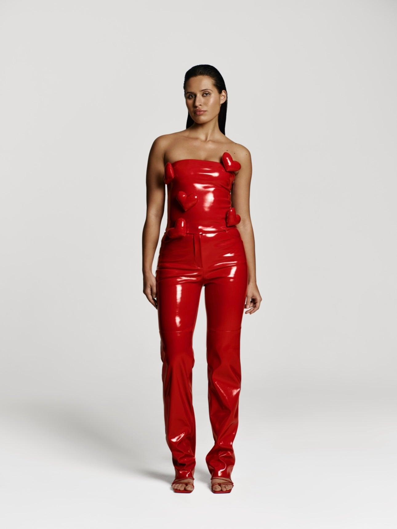 Wrap yourself in love this Valentine's with our Love Killa bandeau in Red patent. Crafted with passion, this bold bandeau embodies daring love with its sultry red patent material. The strapless silhouette exudes confidence, while the concealed side zip ensures seamless styling. Adorned with a cascade of voluminous hearts, this piece is a symphony of romance. Pair it with matching pants or Mini Mini skort for a complete, head-turning look.SPOTTED ON: Keyshia Ka'oir Davis