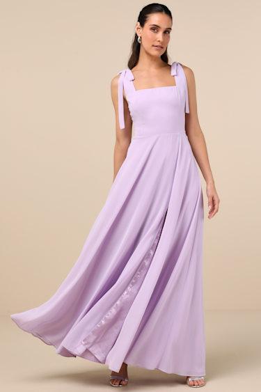 Airy woven chiffon ties at the shoulders to support this graceful A-line dress with a flattering square neck bodice and a fitted waist. Flowing maxi skirt sways effortlessly from side to side thanks to the thigh-high slit at the side. Hidden back zipper/clasp.