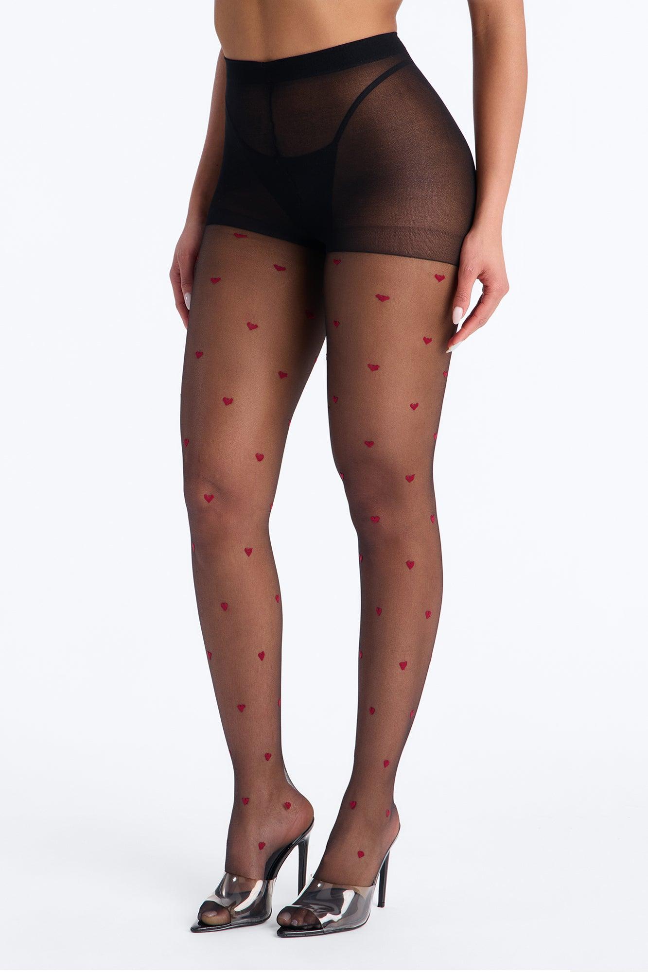 Available In Black/Red. Sheer Tights Heart Detail Stretch Final Sale Self: 90% Nylon 10% Spandex Imported California Proposition 65WARNING: Cancer and Reproductive Harm - www.P65Warnings.ca.gov.