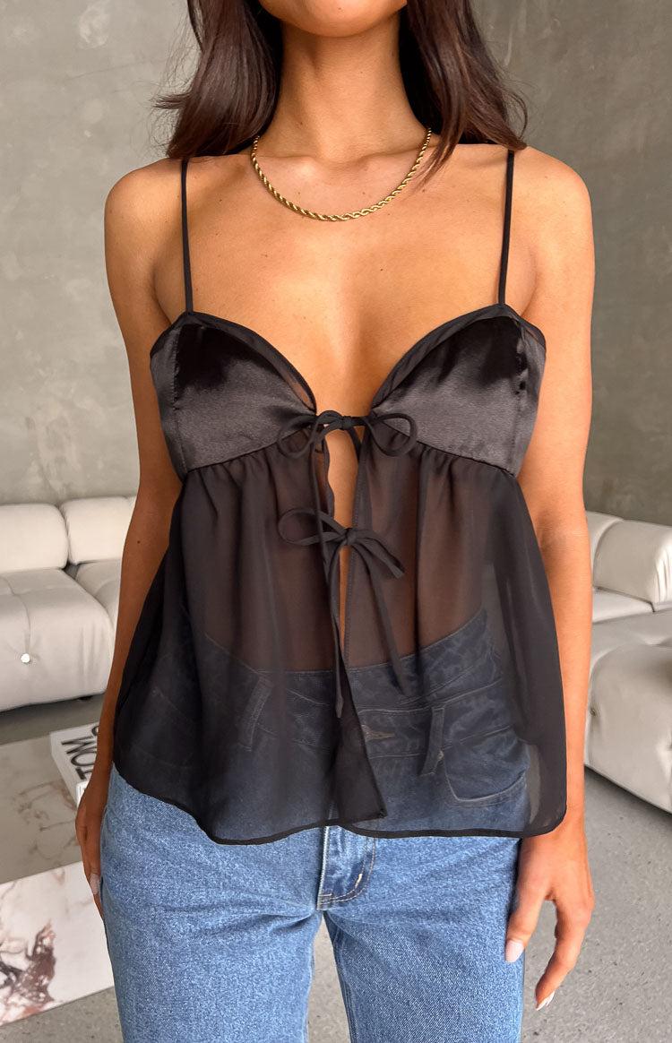 Black Satin Cami TopHow to style:How cute is this Cami Top! Style with a pair of denim jeans and sneakers for a casual outfit to wear out with friends. Turn some heads by elevating the look with a pair of white satin pants and heels.Features: Full length Adjustable tie front Sweetheart neckline Spaghetti Straps Fully lined bodice Sheer bottom panel Lightweight satin material Non stretch material