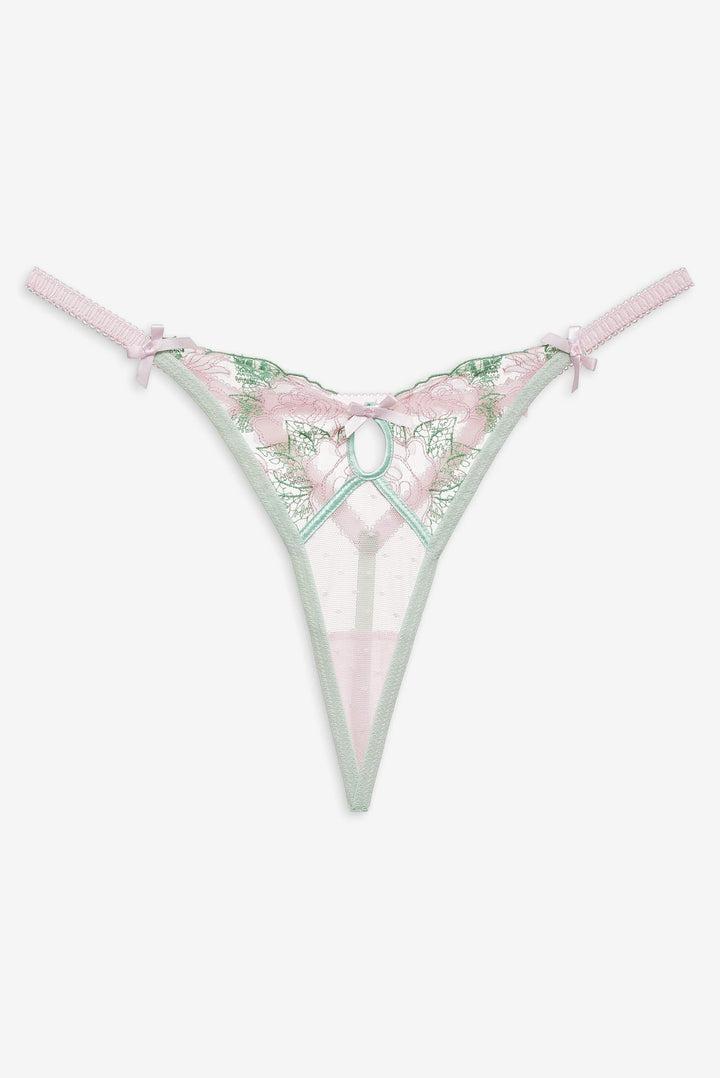 Introducing the Love Story pink panty, too charming to keep hidden away. Crafted in a romantic pink and green floral embroidery and dotted mesh, this g string features a decorative keyhole cut-out at center-front and is adorned with decorative elastic and satin bows throughout. Pair it with the Love Story Underwire Bra to complete the lingerie set.