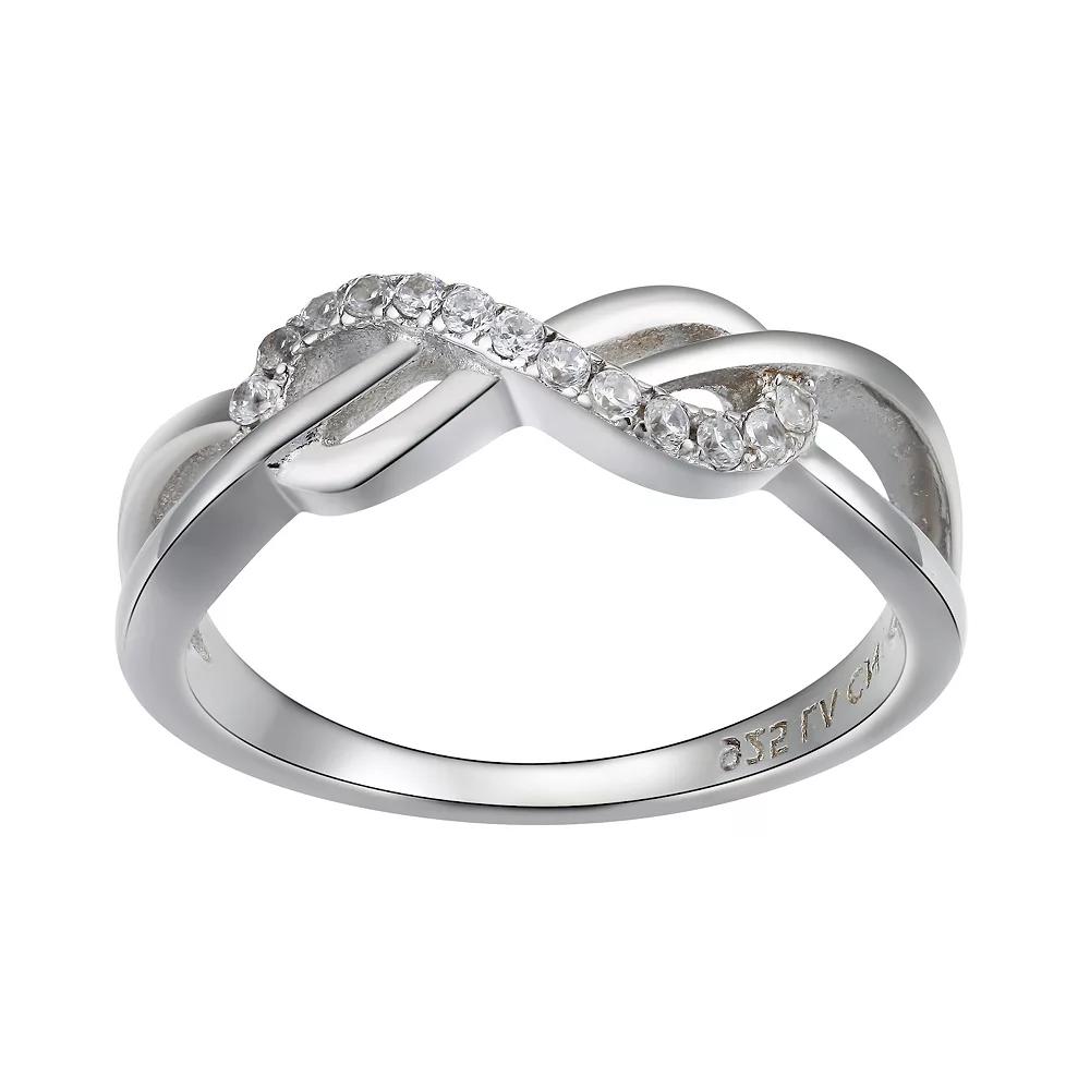 Prove that true love is everlasting with this gorgeous sterling silver infinity ring.Click on this JEWELRY & WATCHES GUIDE to learn about fit, styles, materials and more! Metal: sterling silver Packaging: boxed Additional details: cubic zirconia accents Width: 5.5 mm Finish: polished Please note, due to the high value of this item, a signature may be required upon delivery. Size: 7. Color: White. Gender: female. Age Group: adult.