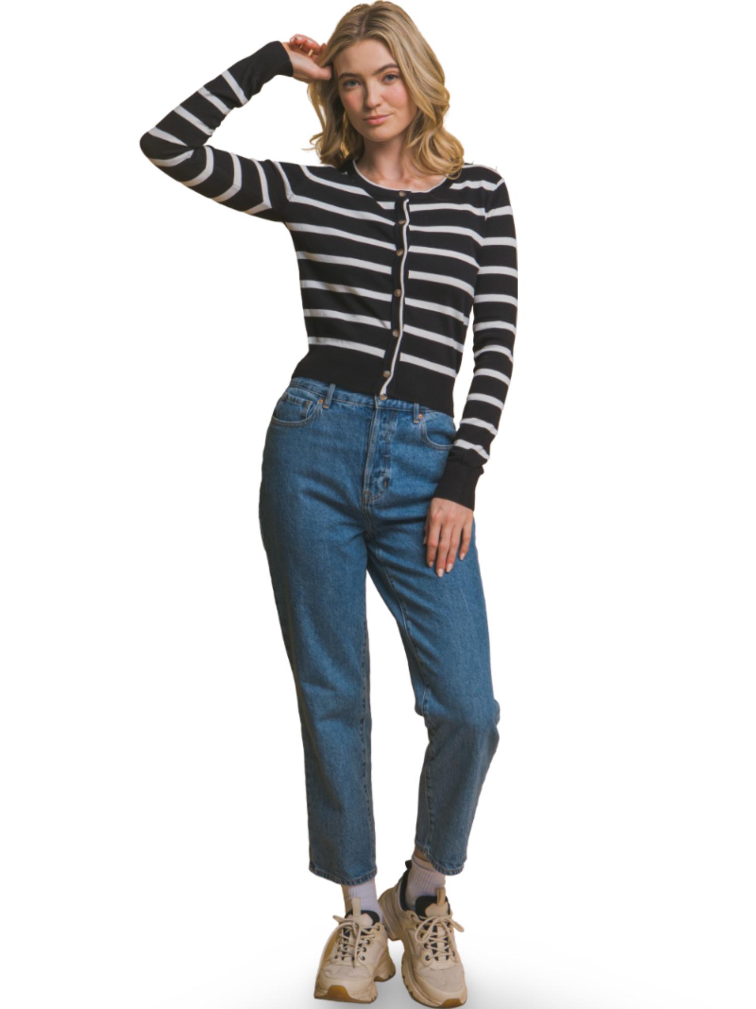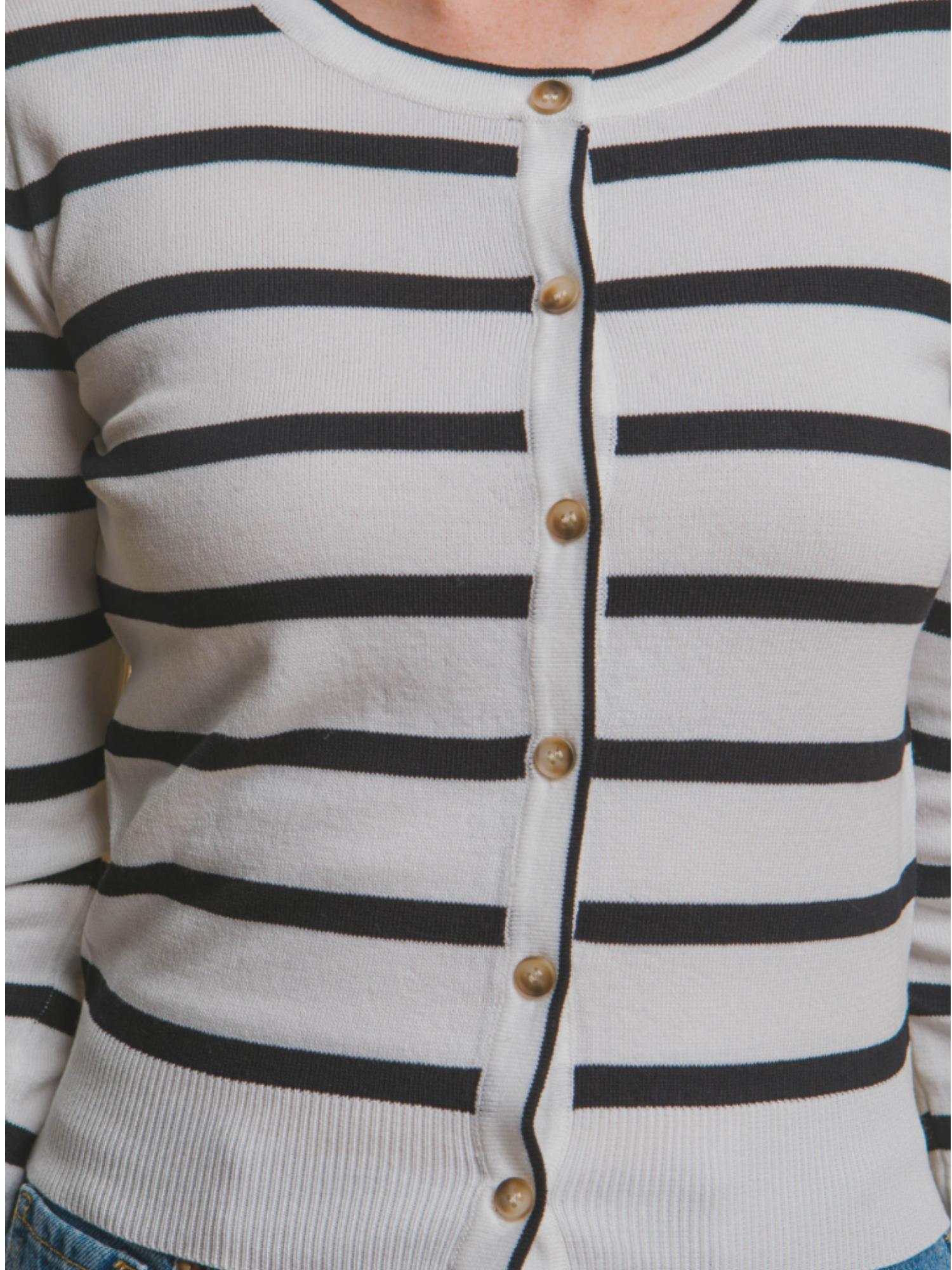 Description - The Love Tree Button Down Knit offers comfortable, lightweight style. 1 Featuring a chic striped print and a classic round neckline, the button-down front adds versatility. Perfect for layering or wearing solo, this knit sweater elevates your everyday look with effortless charm.