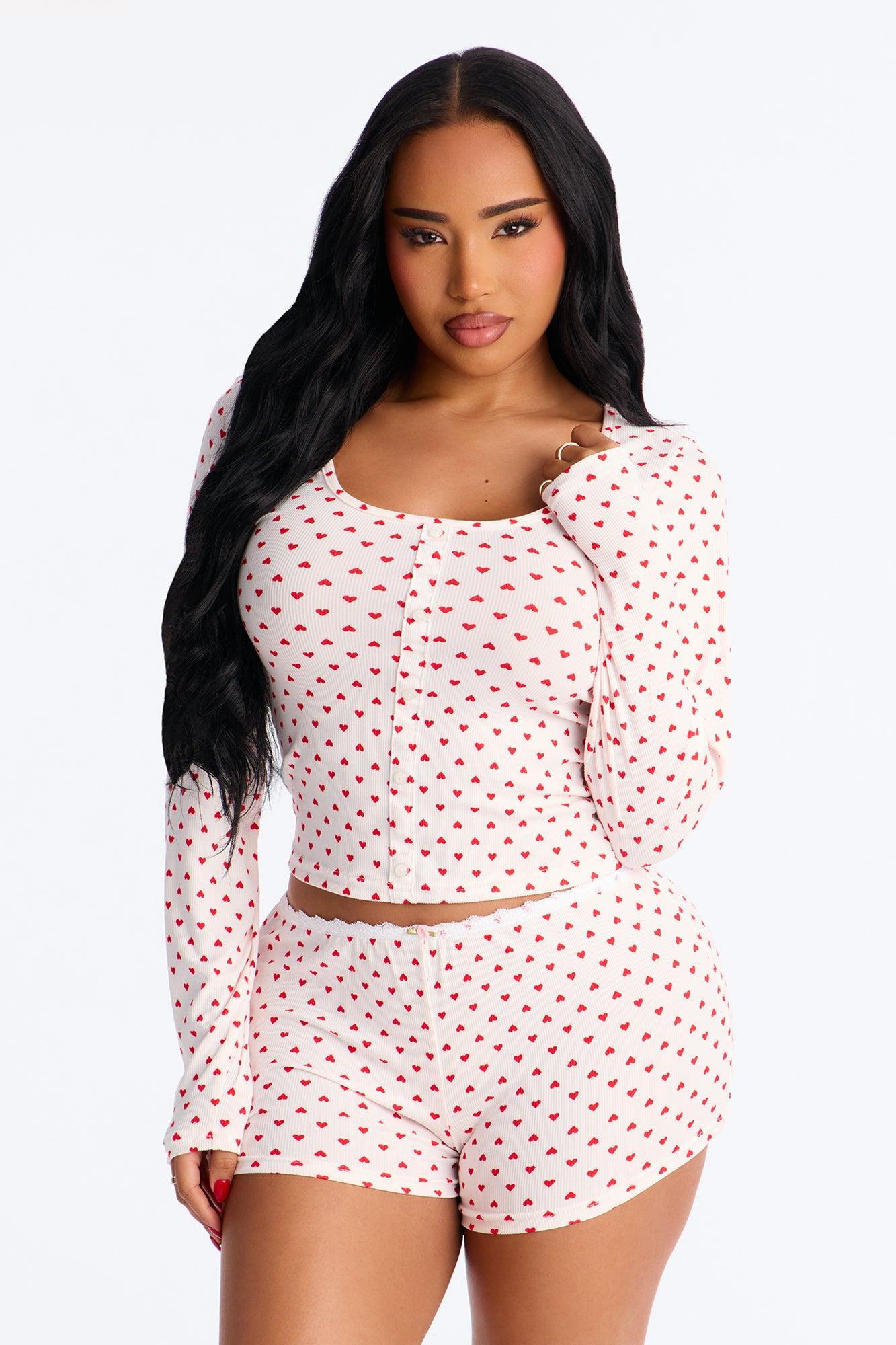 Available In Red/White. PJ Short Set Long Sleeve Top Button Front Matching Short Elastic Waistband Rosette Detail Heart Print Stretch Final Sale Disclaimer: Print Placement Will Vary. Self: 97% Polyester 3% Spandex Imported