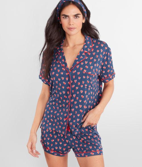Known for playful lounge and sleepwear styles, PJ Salvage is the perfect blend of trends and comfort. No wonder why the PJ Salvage philosophy is ''fashion and comfort 24/7''!, Style Number: RMLMPJ Get a good night's rest in this soft pajama set, All-over heart print adds a romantic flair, Button-down short sleeve shirt with contrasting piping, Left chest pocket on shirt for small item storage, Shorts offer a drawstring waistband; no pockets, 2.5'' inseam on shorts; measurement taken from size S, Includes cute matching headband, Super soft, stretch modal jersey Average Figure,Knit,Modal,Mostly Modal,Spandex,NotMaternity,CoolSleepwear,Pajama,Pajama Set,Shorts,SleepNotSexy,Tops,Short Sleeve,_Newimage,Pocket,Set,Sleepwear