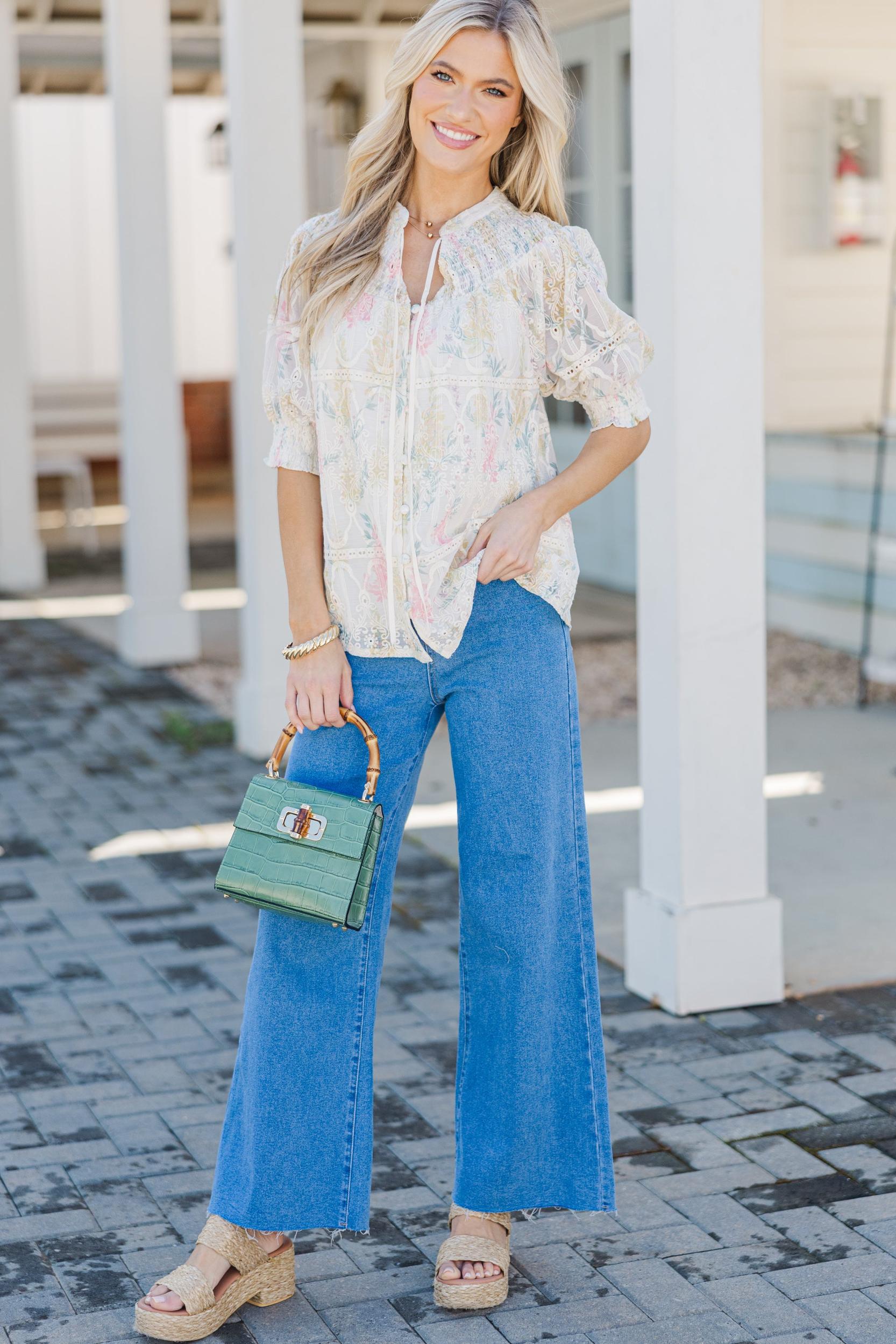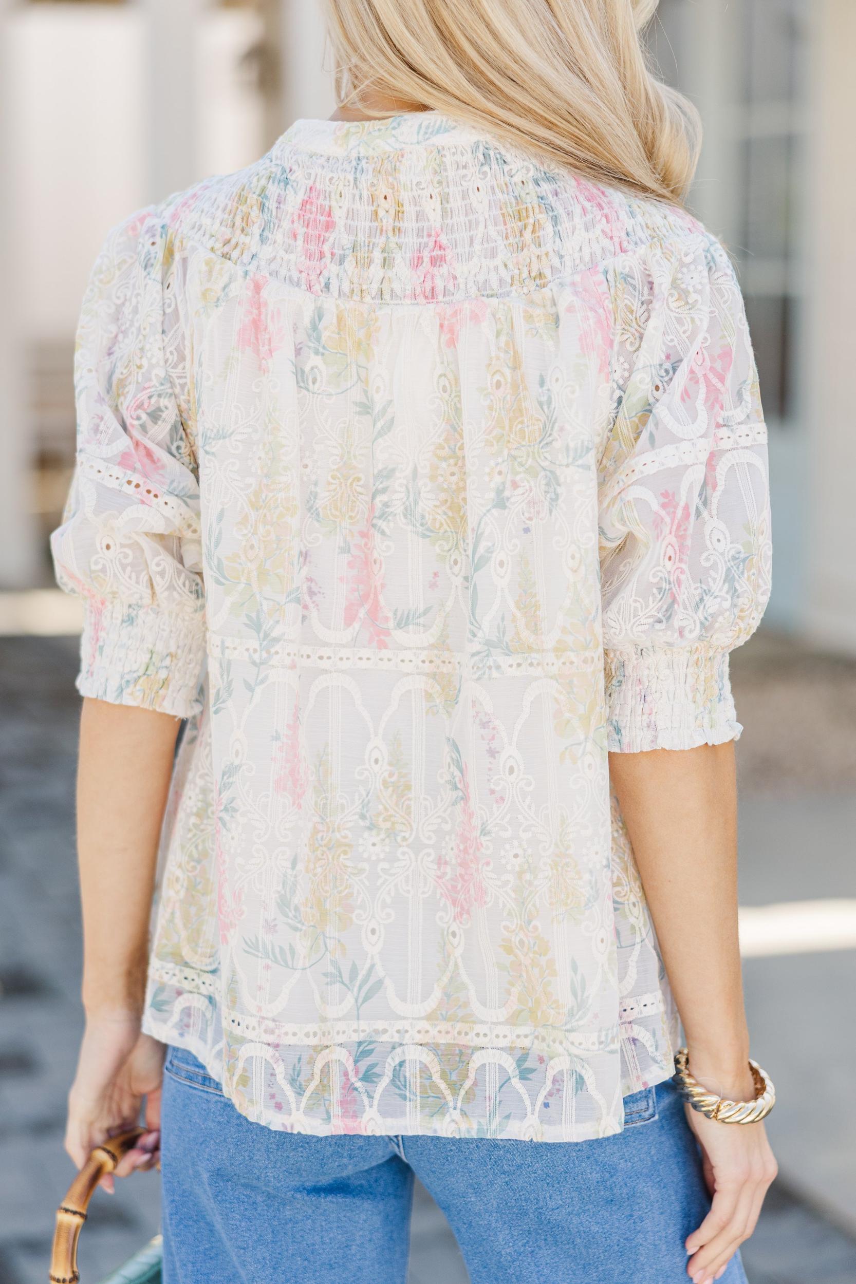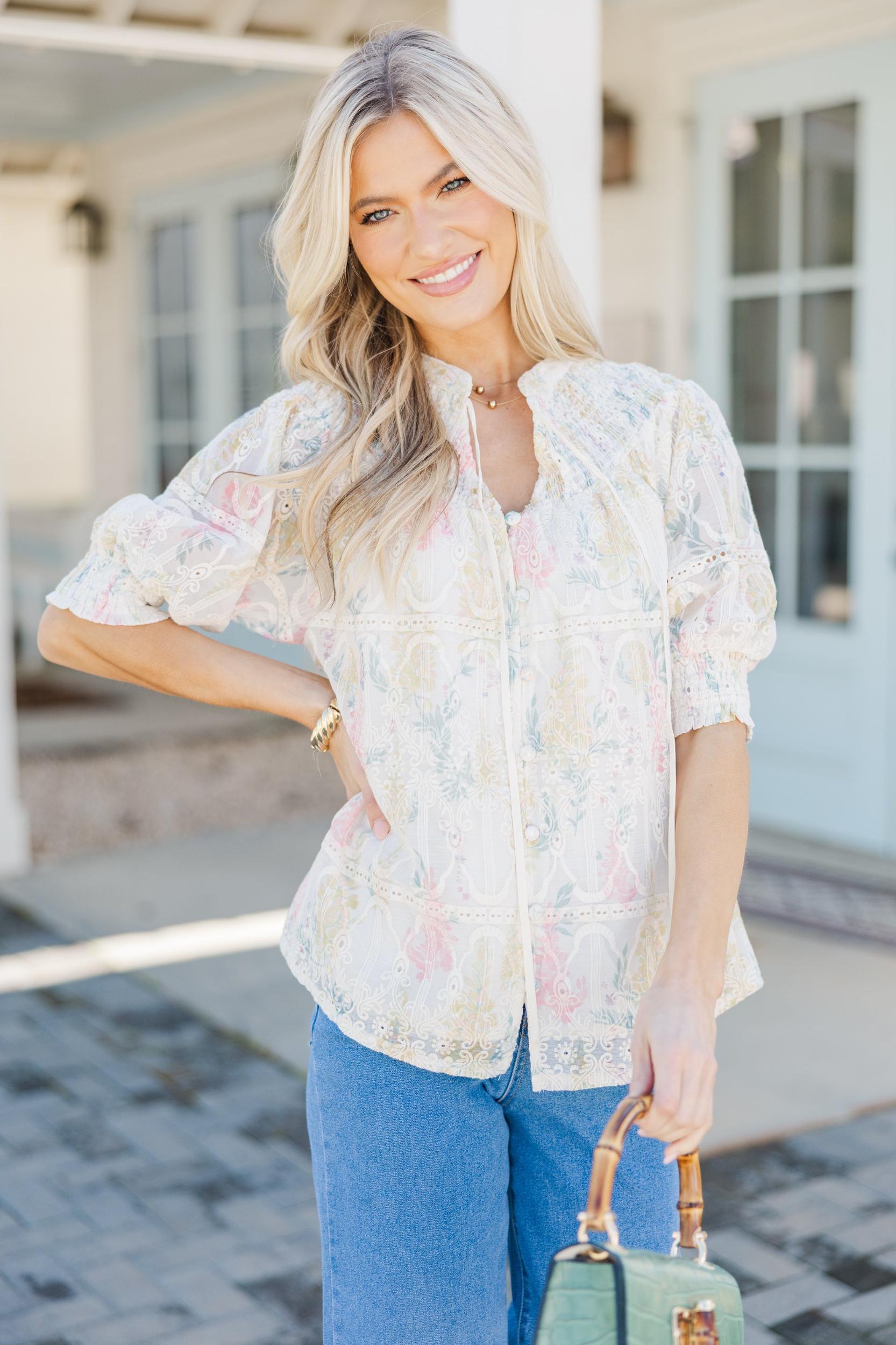 This sweet yellow eyelet blouse is giving all the sunshine vibes! With its ruffled shoulders, button front, and intricate embroidery, it’s the perfect top for picnics or patio lunches. The lightweight fabric and soft fit keep things comfy and cool. Just pair with white jeans and a smile! V-neckline Button down front closure Short puff sleeves Watercolor eyelet fabric Material has no amount of stretch Baileigh is wearing the small.