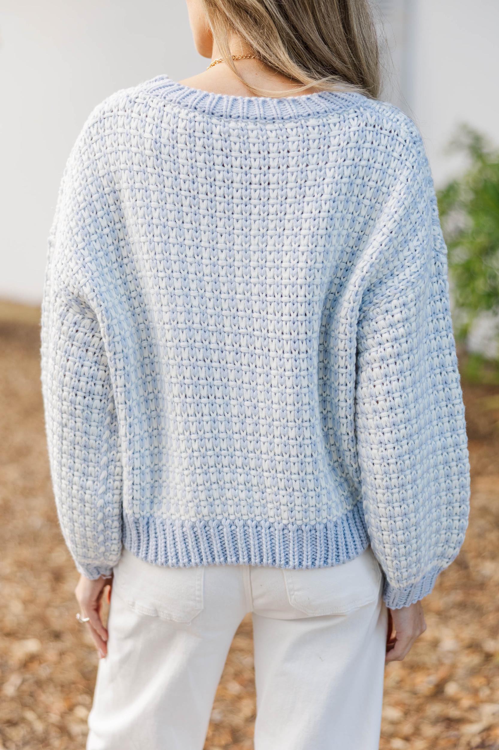 This soft blue knit sweater is an easy favorite for effortless, everyday style. The textured knit adds subtle dimension while keeping the look relaxed and cozy. Perfect for pairing with denim or white pants, it transitions seamlessly from casual days to dressed-up moments. Round neckline Long sleeves Relaxed fit Ribbed hemline Slight stretch London is wearing the small.