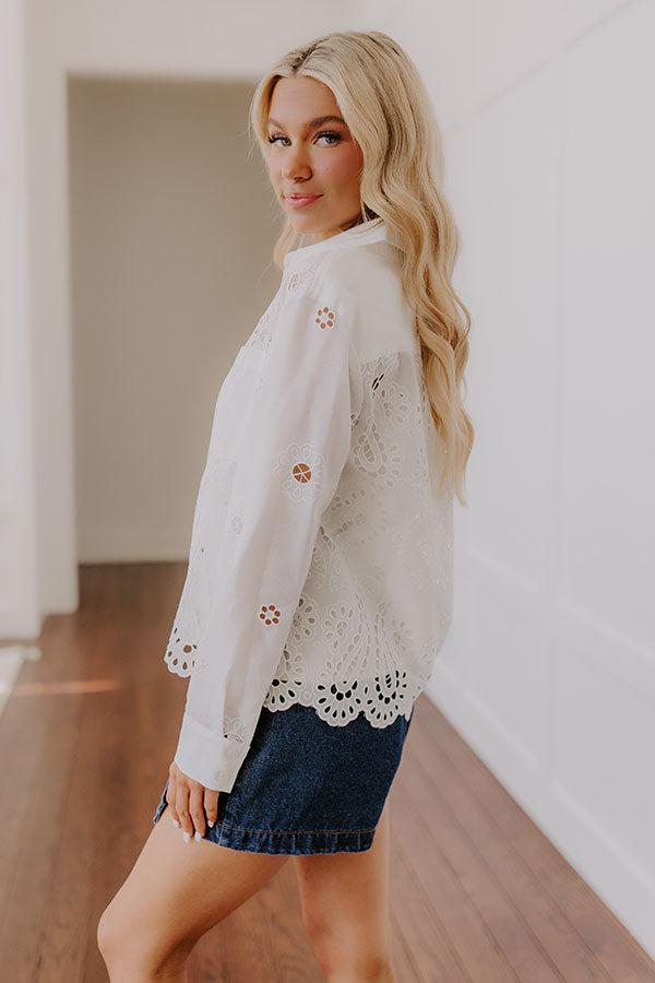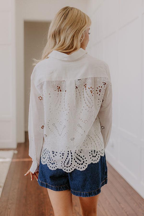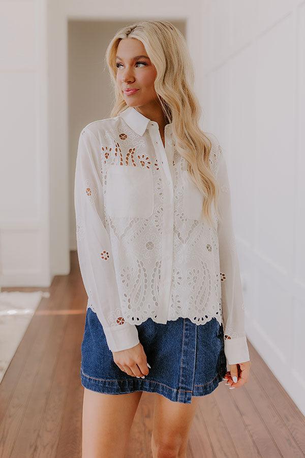 - Make every moment lovely with this darling eyelet top! The breezy material and sweet, feminine design are perfect for those carefree, sunny days, bringing a touch of charm to your casual look. - Lightweight eyelet material - A collared neckline - A button up front - Long sleeves with buttoned cuffs - Functional chest pockets - A relaxed silhouette that ends in a scalloped hemline - This top comes with a separate camisole with adjustable spaghetti straps and a scoop neckline