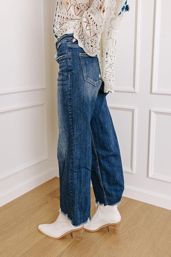 - The season's trendiest jeans have arrived! These cuties have wide legs, distressed detailing, and style for days! Step into laid-back energy with these must-have jeans. - Unlined stretchy denim material with subtle fading and distressed detailing - A midrise waistline with belt loops - A hidden zip fly and button closure - Functional front and back pockets - A wide leg silhouette that ends in unfinished frayed hemlines