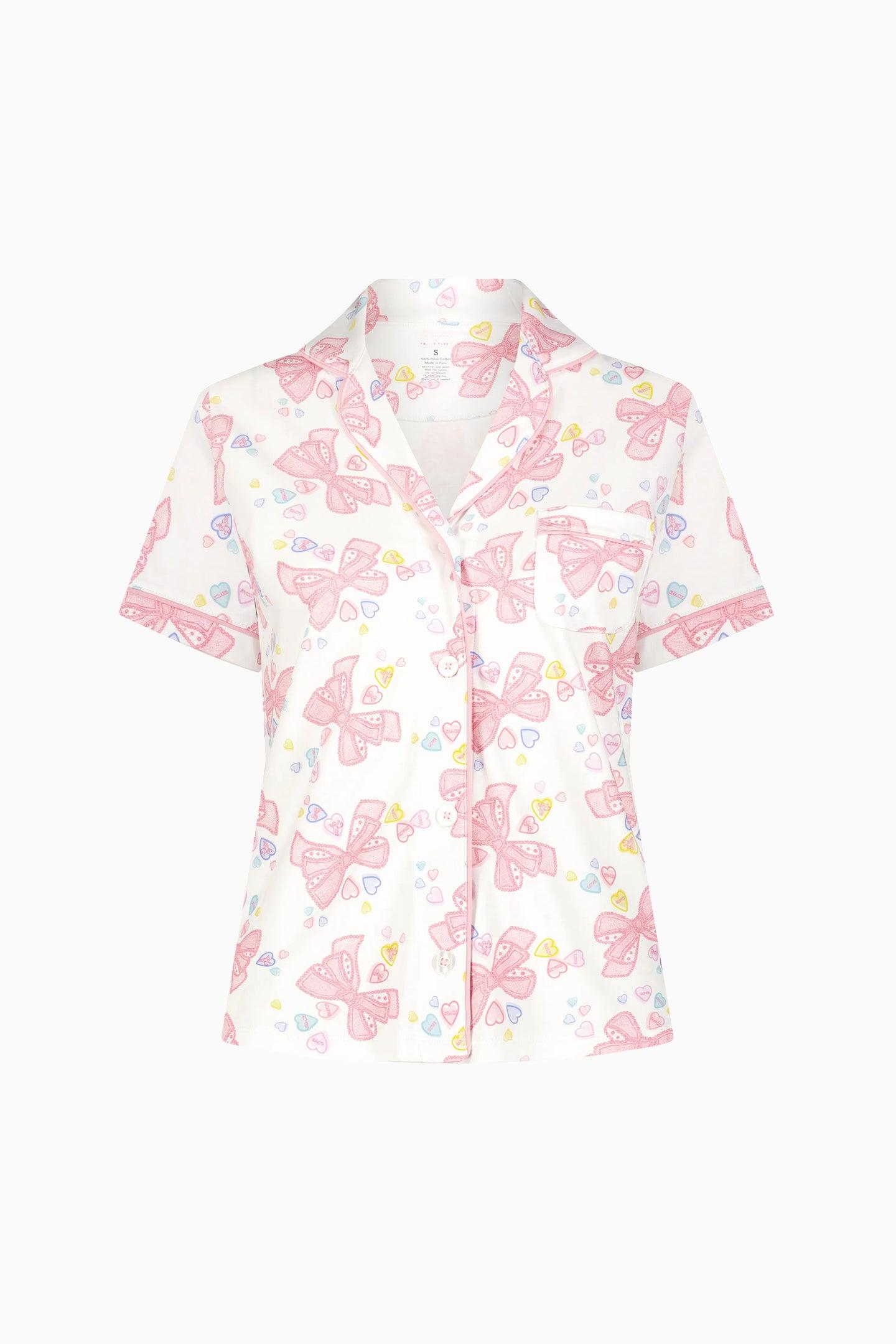 Pretty in pink Doily Beaux, this silky-soft Pima cotton polo pajama set designed in partnership with Roller Rabbit features a short-sleeve top and matching shorts in our sweetest bow print. Adult model wears size S Tween model wears size XXS