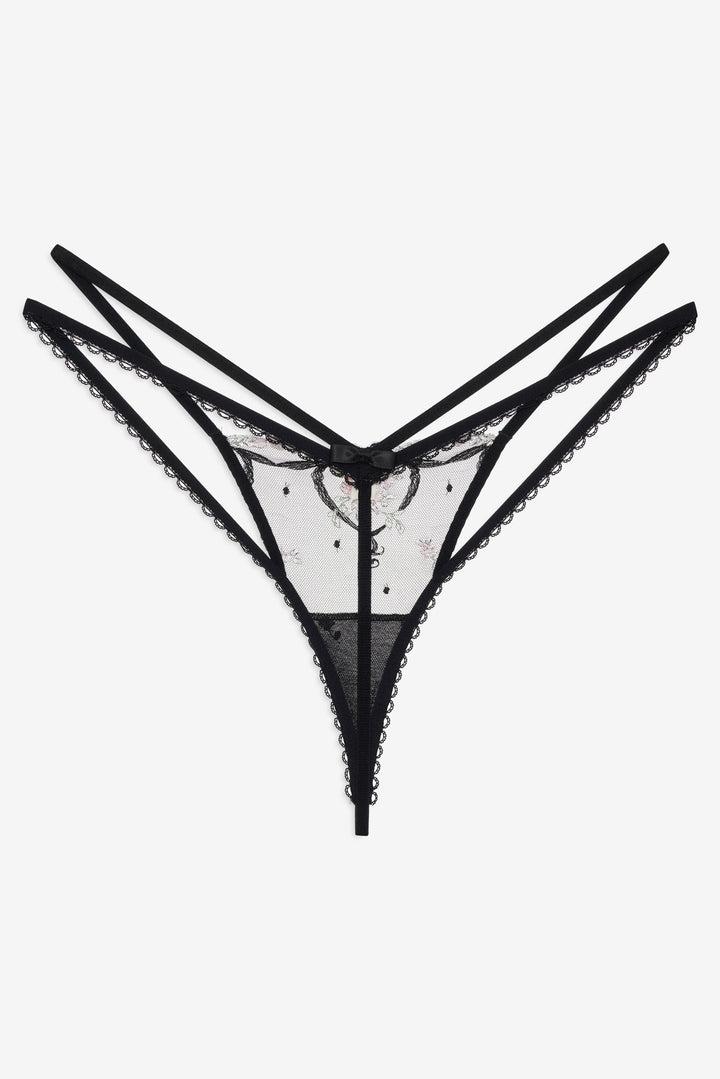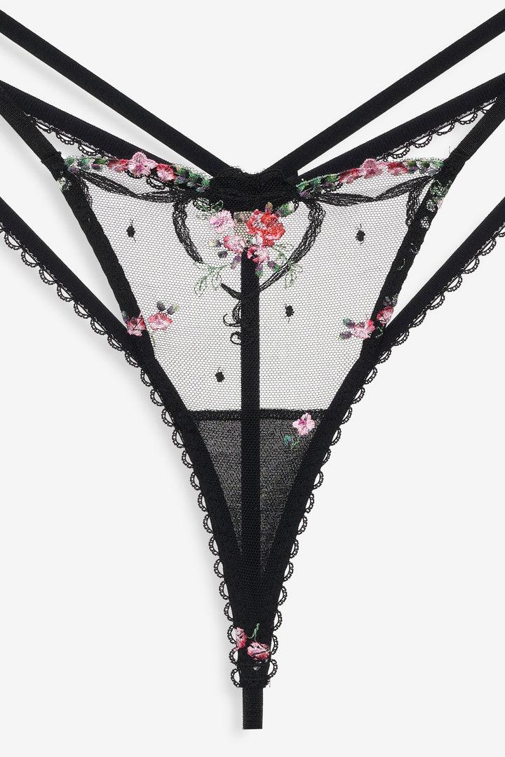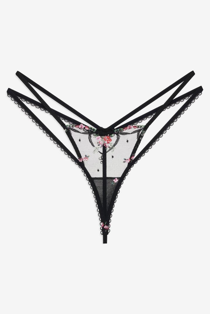 Daringly romantic, this black thong blooms with embroidered flowers across sheer mesh and is finished with a double hip strap and a sweet satin bow. Complete the look with the Lovestruck Bows Underwire Bra and Lovestruck Bows Garter.