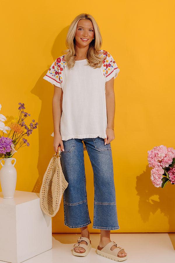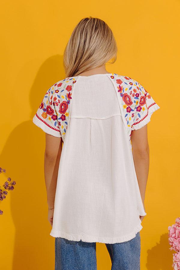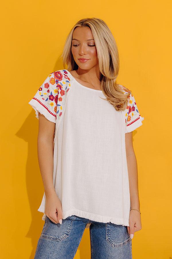 - Take a beachside stroll in this beautiful top! - Unlined material - A wide round neckline - Short sleeves featuring colorful floral embroidery with unfinished frayed cuffs - A relaxed silhouette that ends in a rounded hemline with frayed detail
