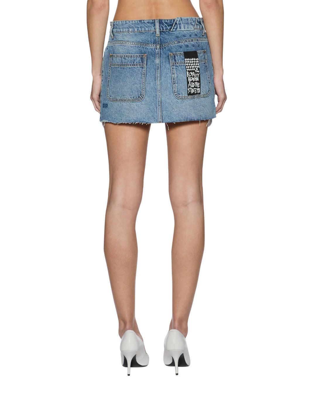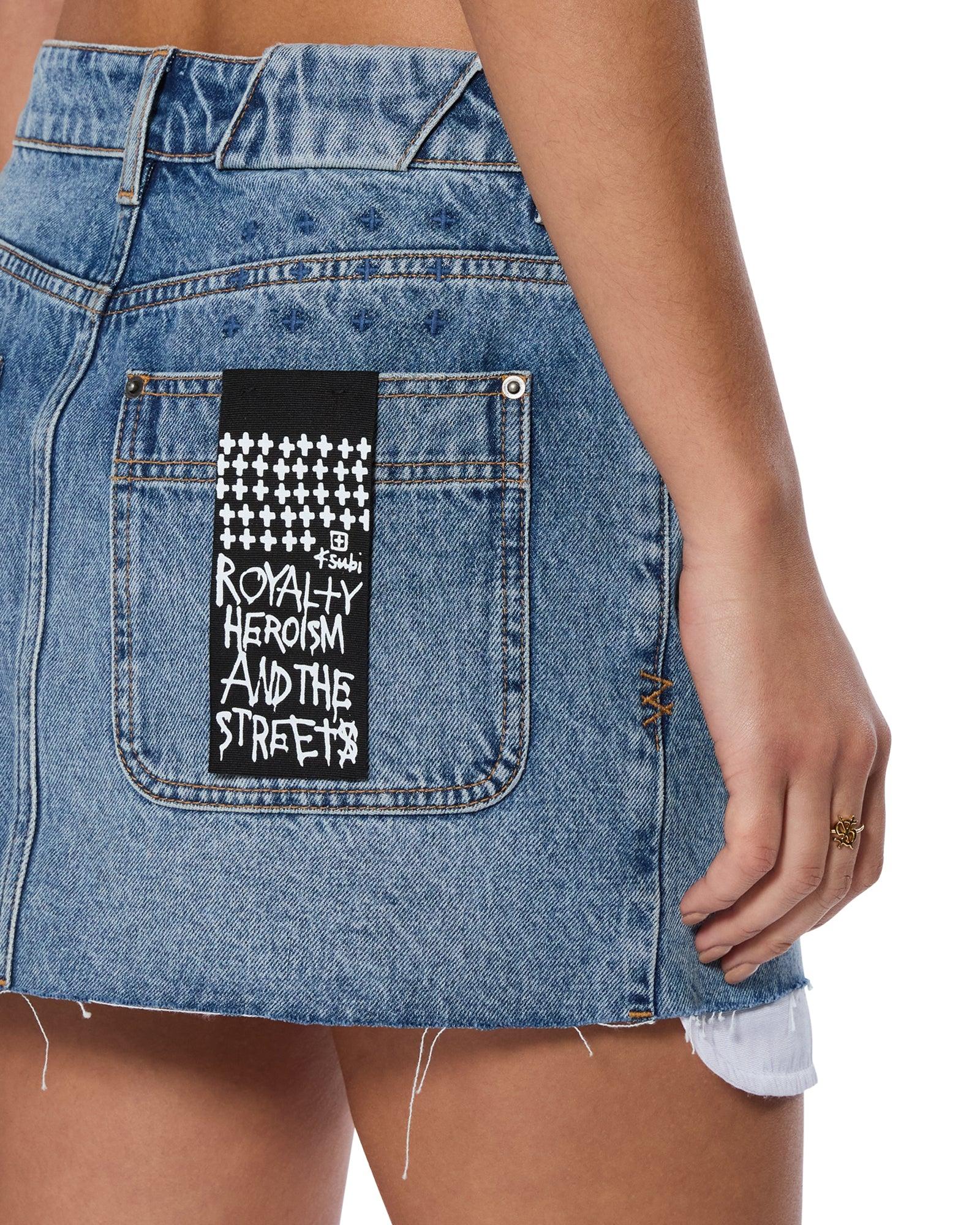 The Low Rider Mini Exposed Swept is a low-rise mini skirt with classic five-pocket styling, made from premium European rigid mid-blue denim with stone wash and neutral tint. It features exposed pocket bags at the hem, signs of wear, and subtle grinding at the waistband hem and pockets. Finished with Ksubi anti-silver branded hardware, T-box and 3x4 embroidery, and a removable pocket tag attached to the wearer's right back pocket, style it back with the Bolt Top Swept.