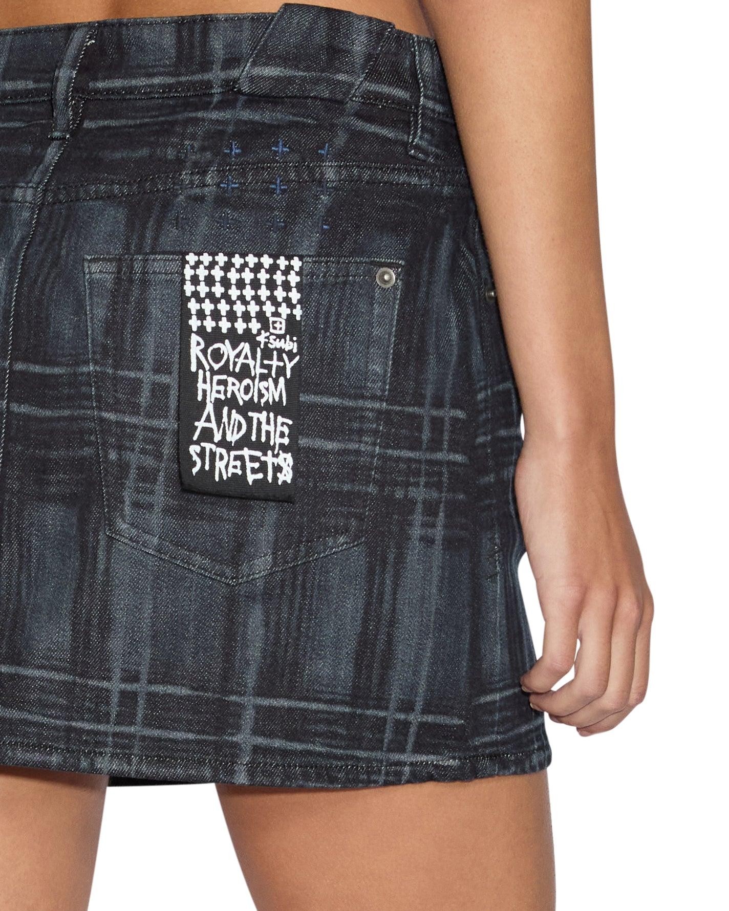 The Low Rider Mini Skool is a low rise skirt made from a blue and black stretch denim fabric with a custom etched plaid all over pattern. Designed to sit lower on the hips for a relaxed look. Style with the matching Gigi Bustier Skool for a twin denim look.
