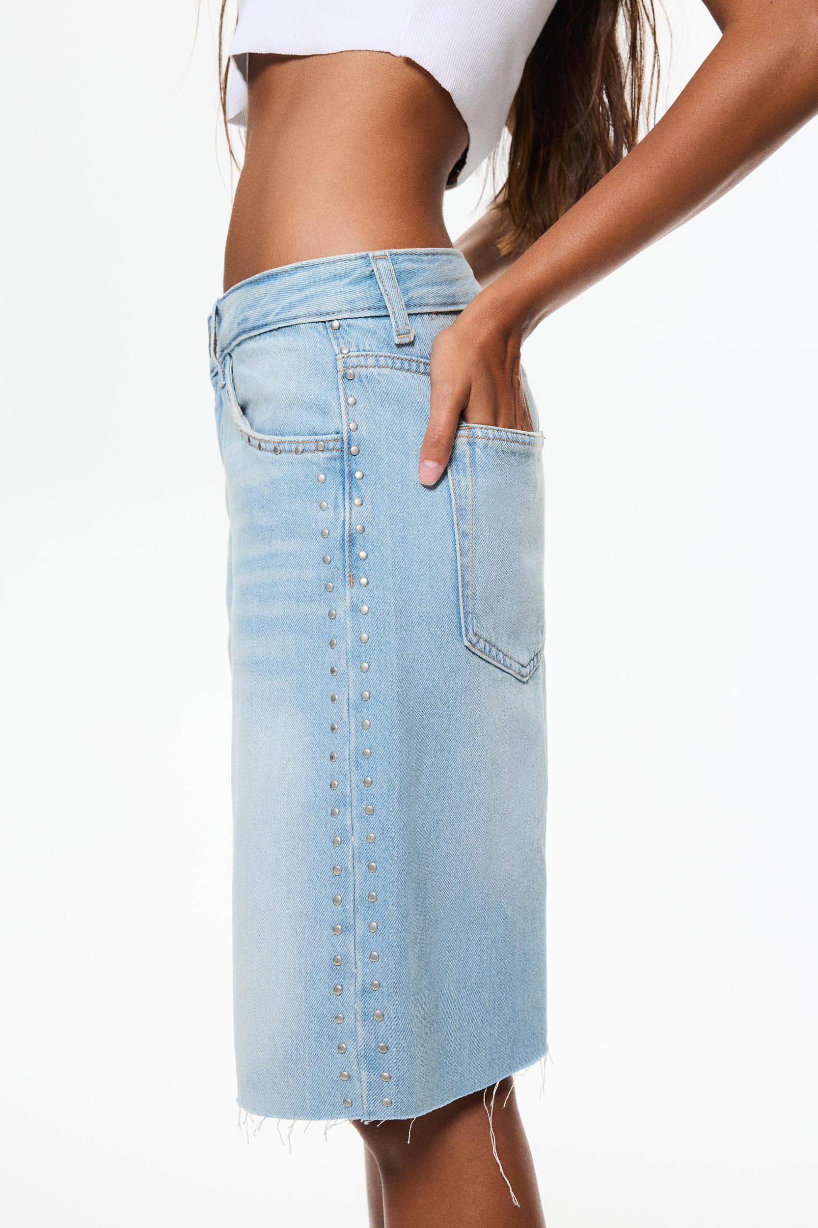 WAIST: Low rise FABRIC: Non-stretchy Low-rise baggy denim Bermuda jorts with stud details, a five-pocket design, belt loops and zipper fly and top button fastening. Made of 100% cotton.