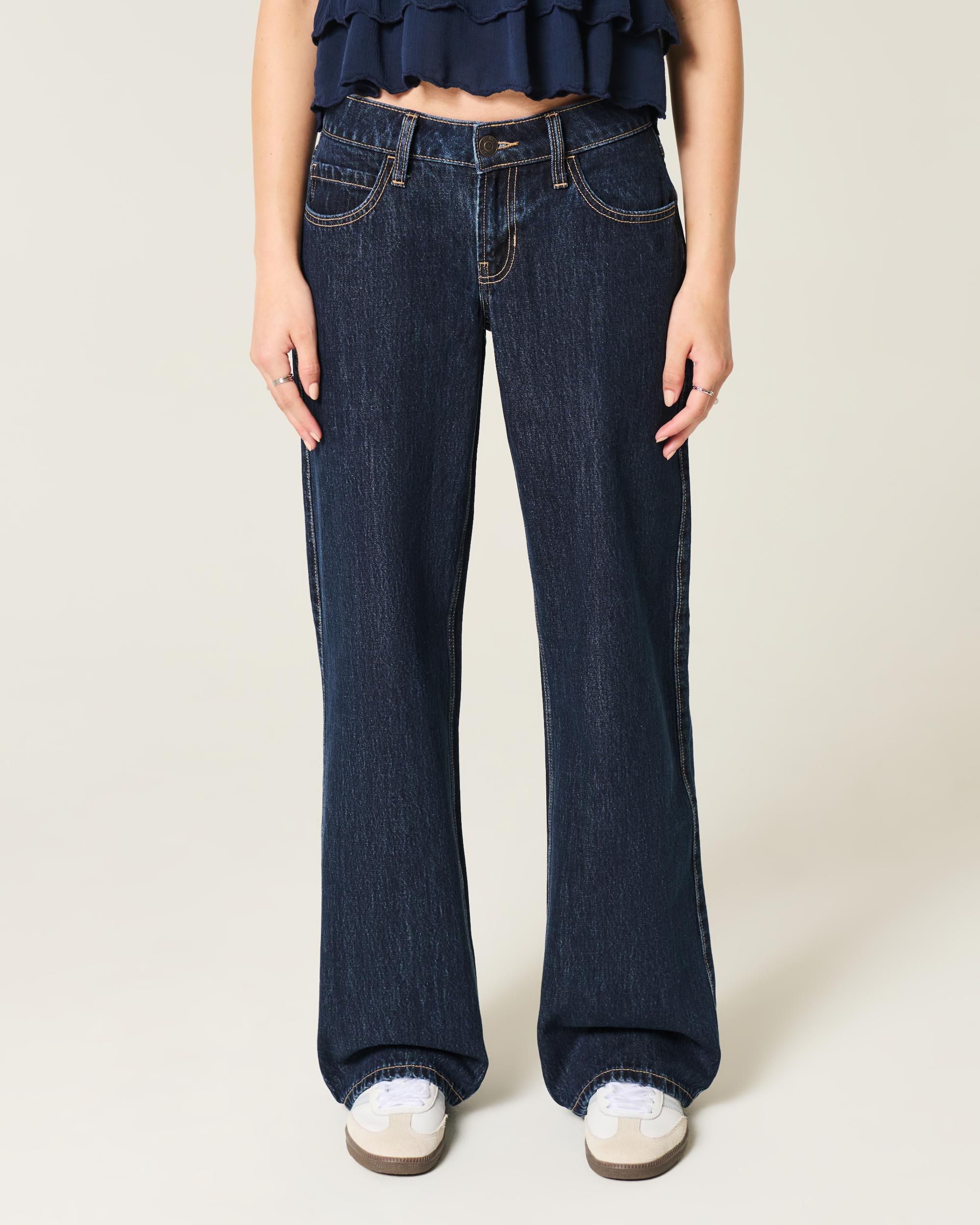 Comfortable denim jeans designed with a flattering low-rise waist and baggy leg. Foldover waistband with interior pattern, dark wash.