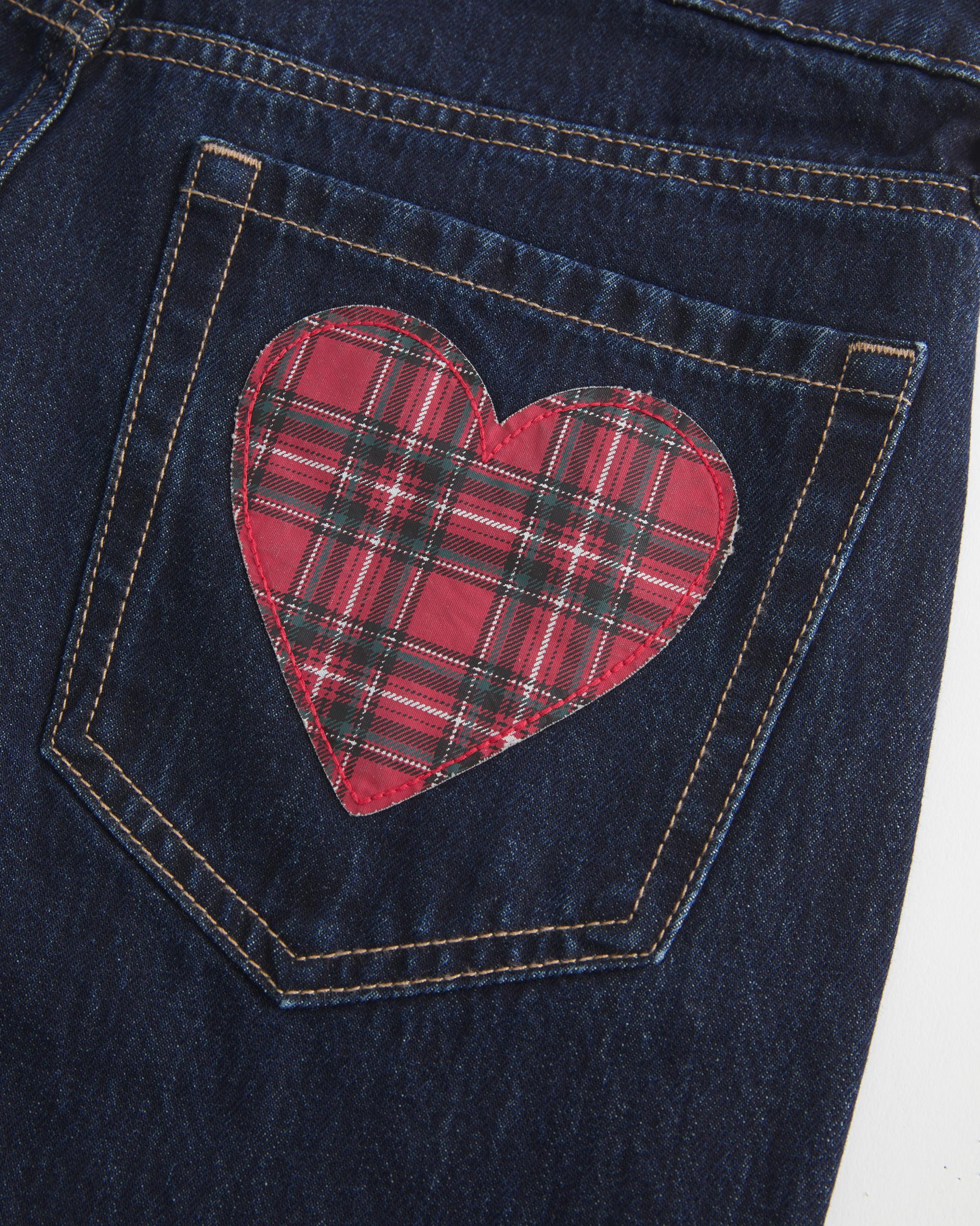 Cute and comfy jeans designed with a low-rise waist and baggy leg. Back-pocket plaid hearts, dark wash denim.