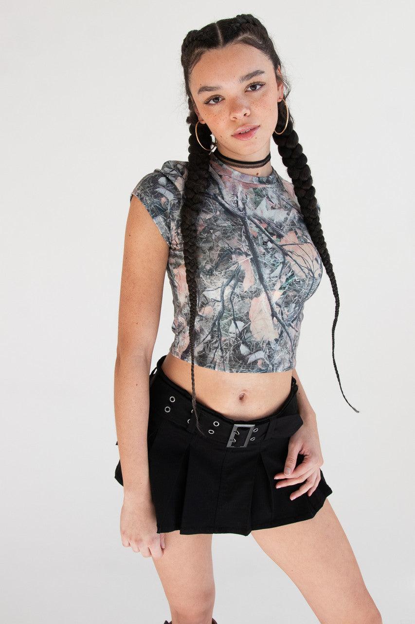 Low Rise Pleated Belted Denim Mini Skort