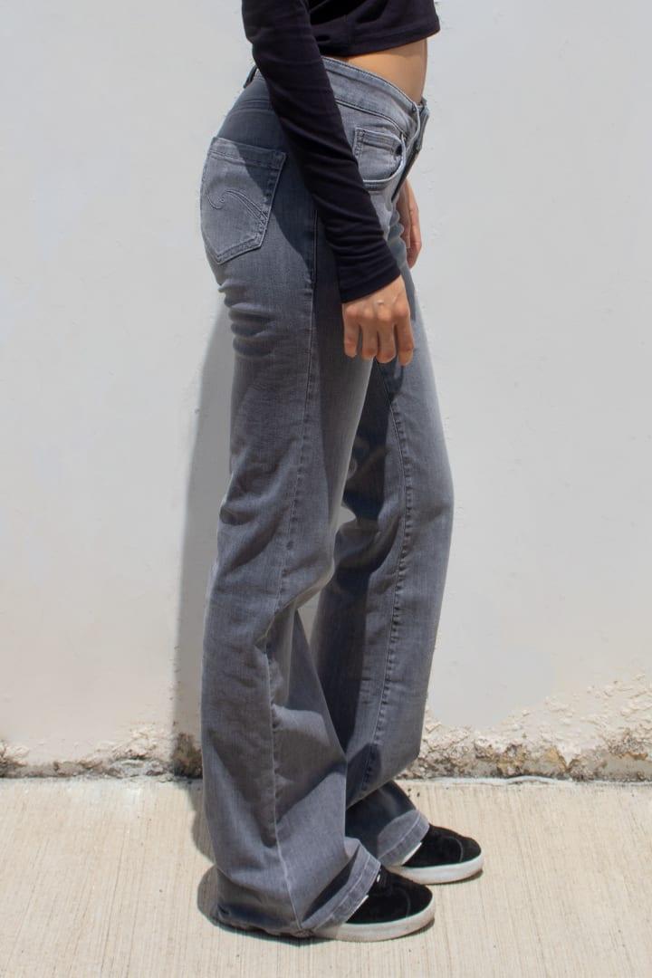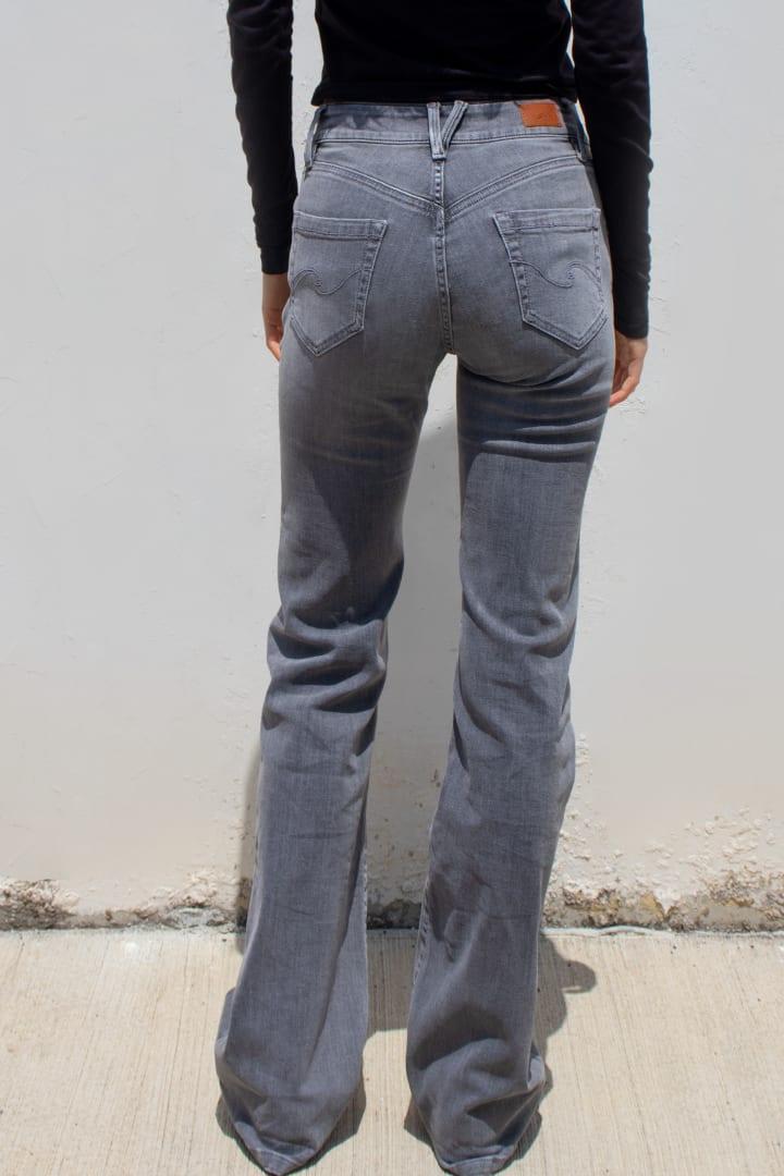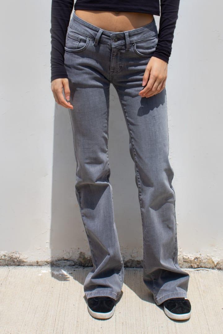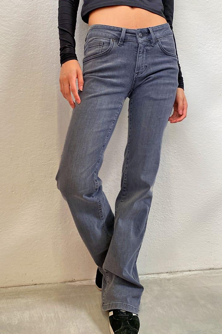 Flare jeans, low waist, 4 pockets, belt loops, embroidery detail on the back pockets, button and zip fly fastening, regular length, slim fit.