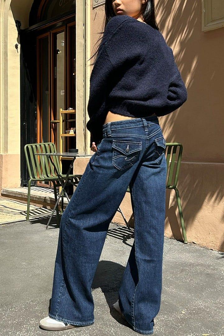 Wide leg jeans, low waist, button and zip fastening, 4 pockets, belt loops, relaxed fit.