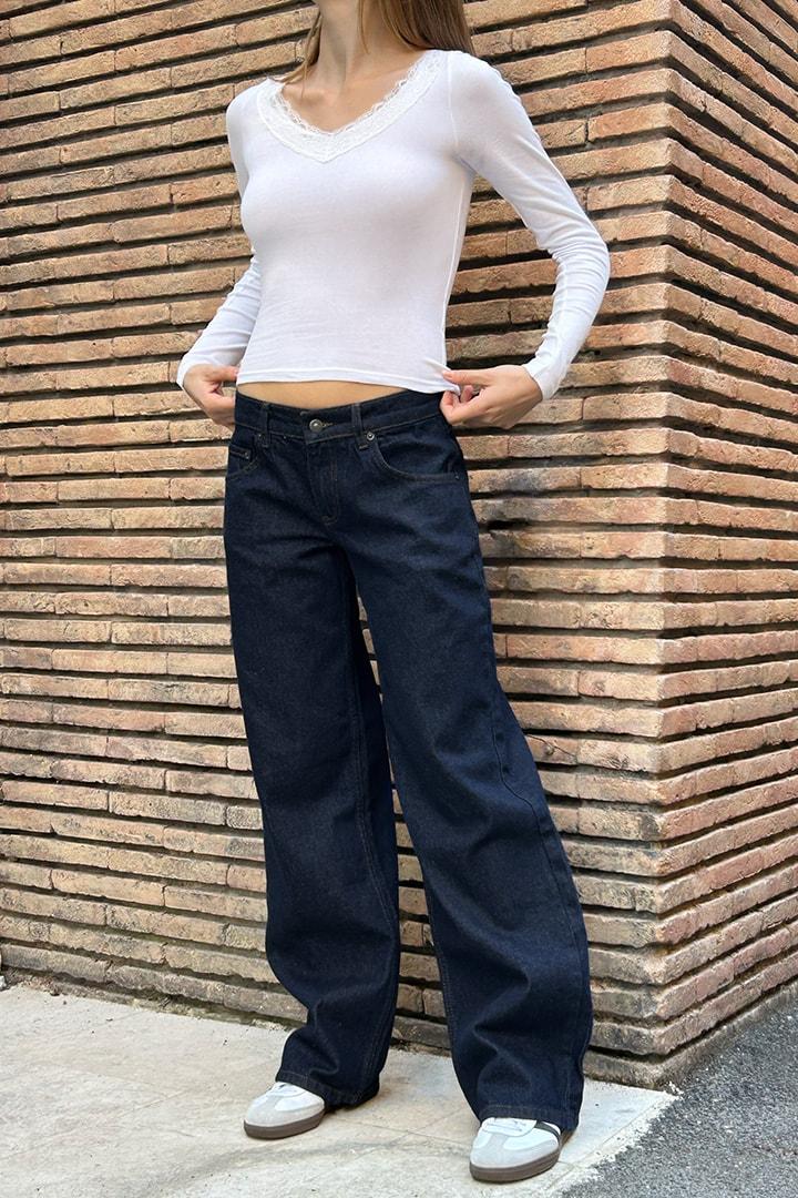 Wide leg jeans, low waist, button up and zip fastening, 4 pockets, belt loops, relaxed fit
