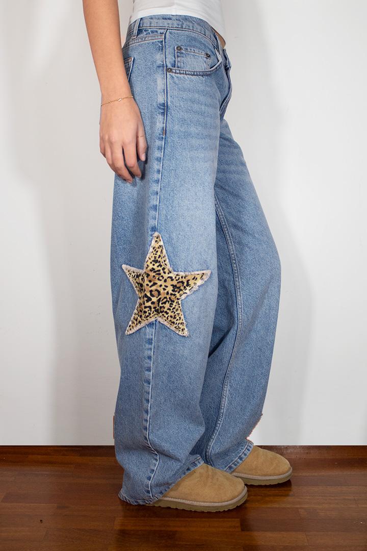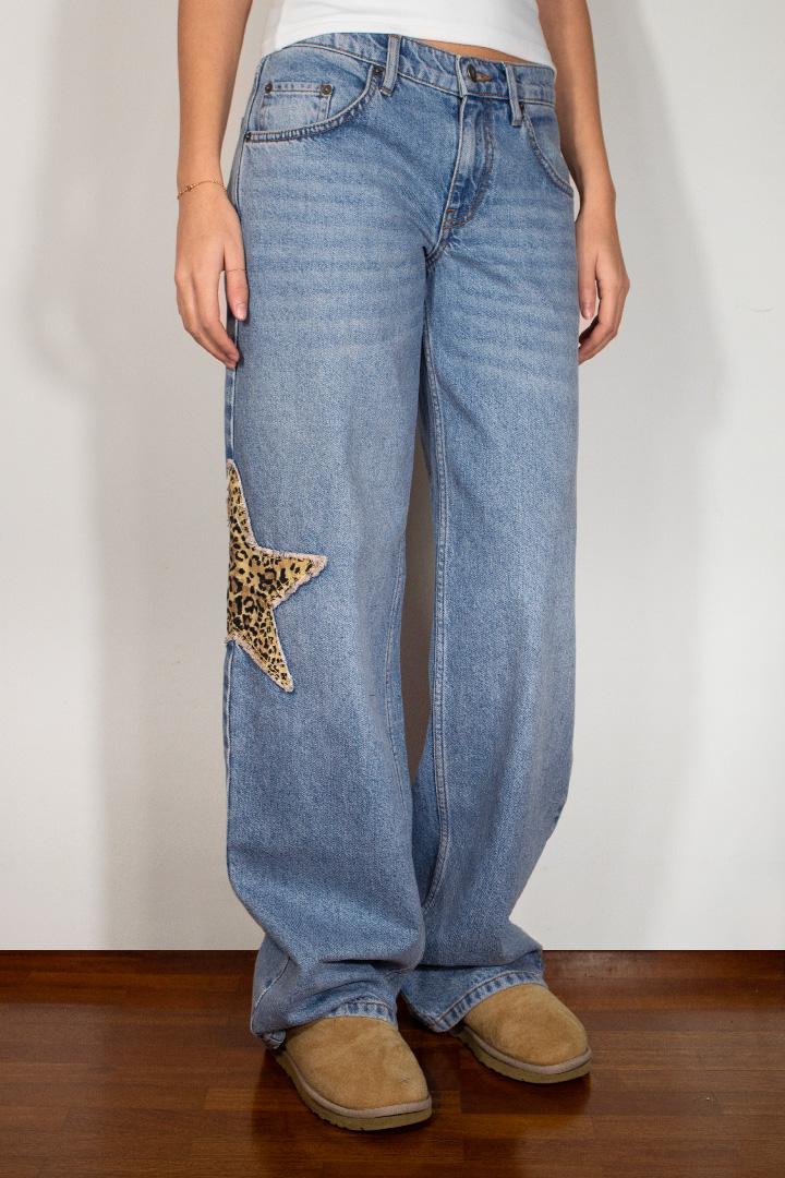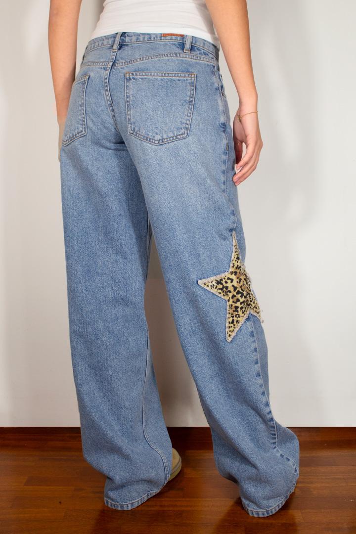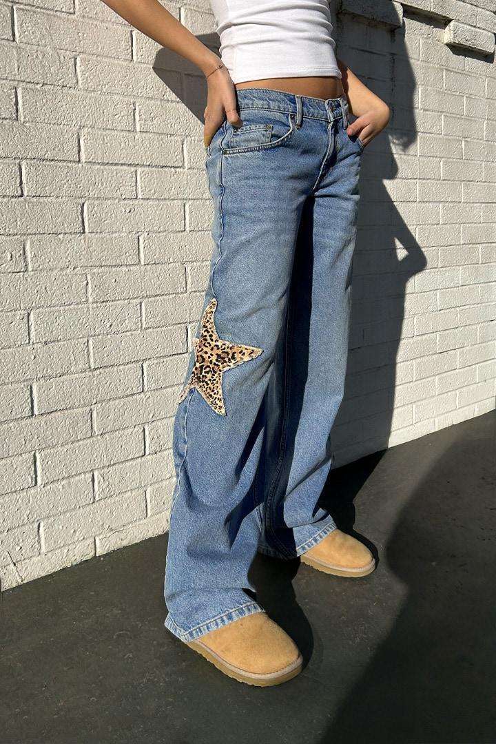 Low waist jeans, with leopard star patch on the side, belt loops, pockets, button and zip fastening, regular length, relaxed fit.