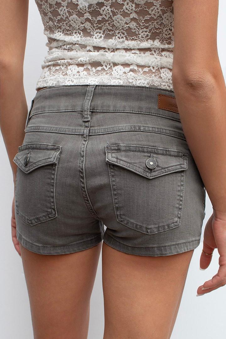 Denim shorts, super low waist, belt loops, back pockets with button, double button up and zip fastening, regular length, slim fit.