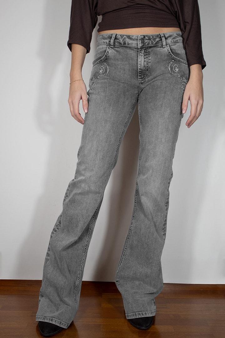 Flared jeans with floral embroidery on front and side pockets, low waist, belt loops, back pockets with buttons, button and zip closure, regular length, slim fit.