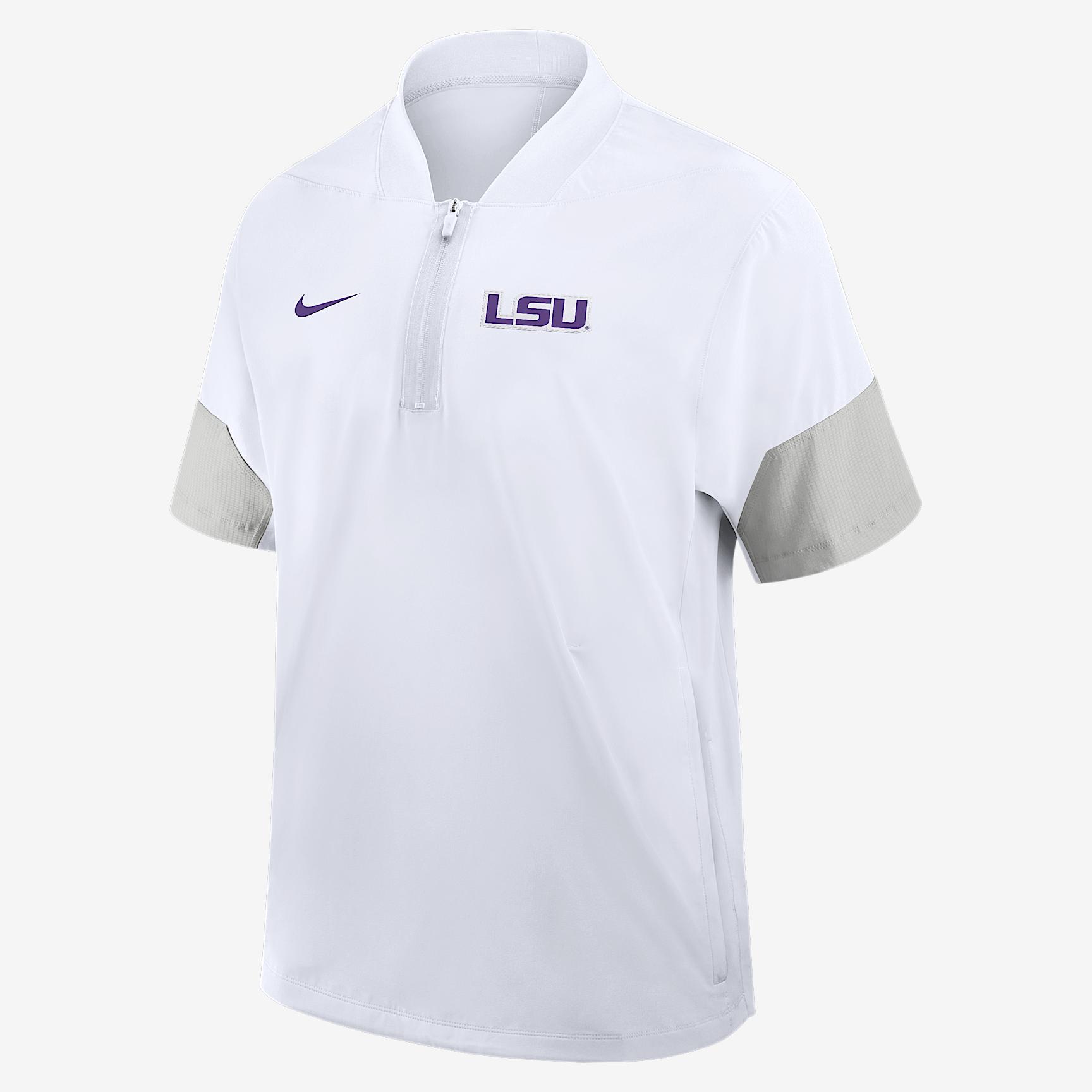 The lightweight design of this Sideline Coach Jacket helps provide premium comfort on game day without the added bulk of a long-sleeve pullover. Its water-repellant fabric features the LSU logo on the chest. [] Product Details:86% polyester/14% elastane. Machine wash. Imported. Style: 03BO0CEBLSN; Color: White; Size: M; Gender: Male; Age Group: Adult | LSU Sideline Coach Men's Nike College 1/2-Zip Short-Sleeve Hooded Jacket in White, Size: Medium | 03BO0CEBLSN-6XU