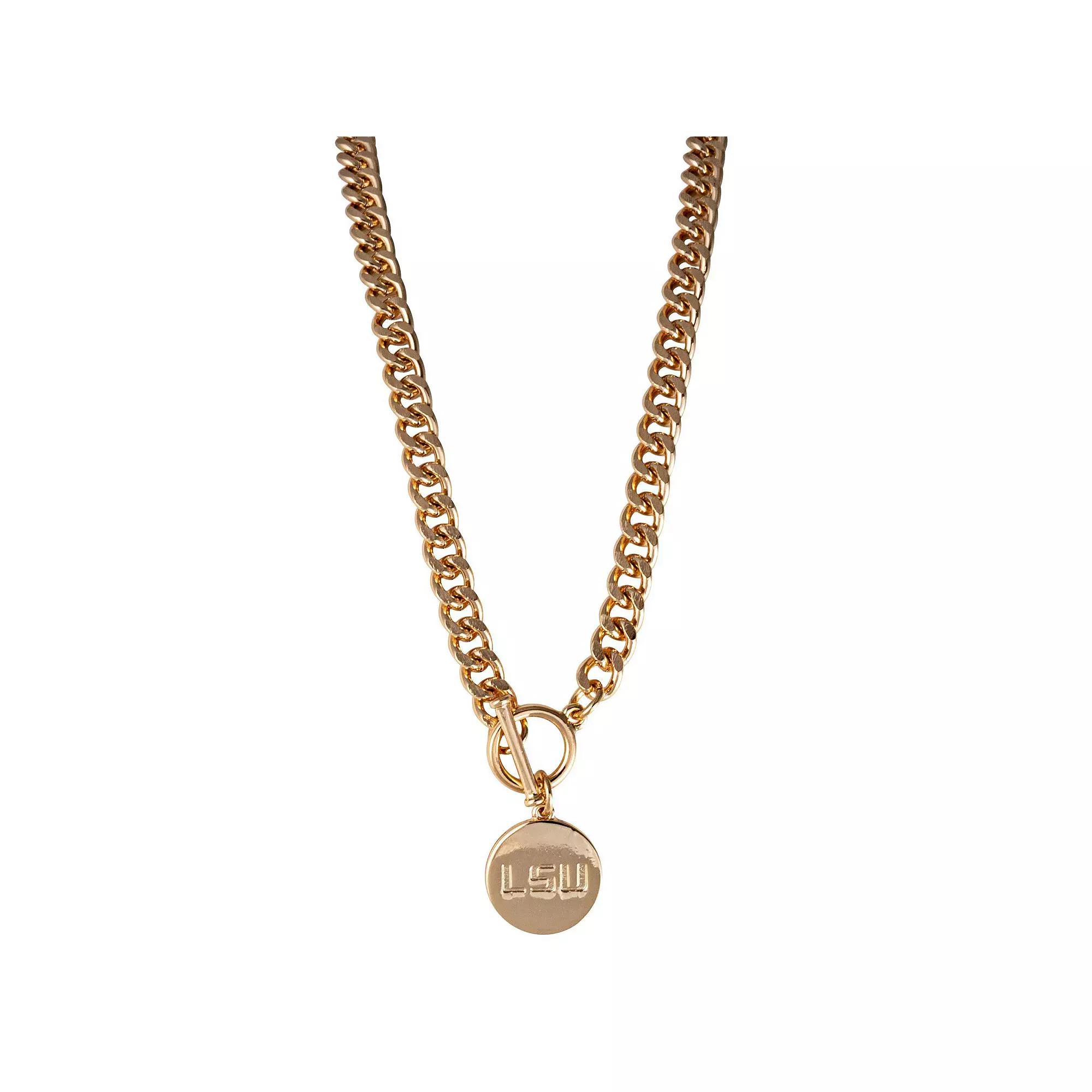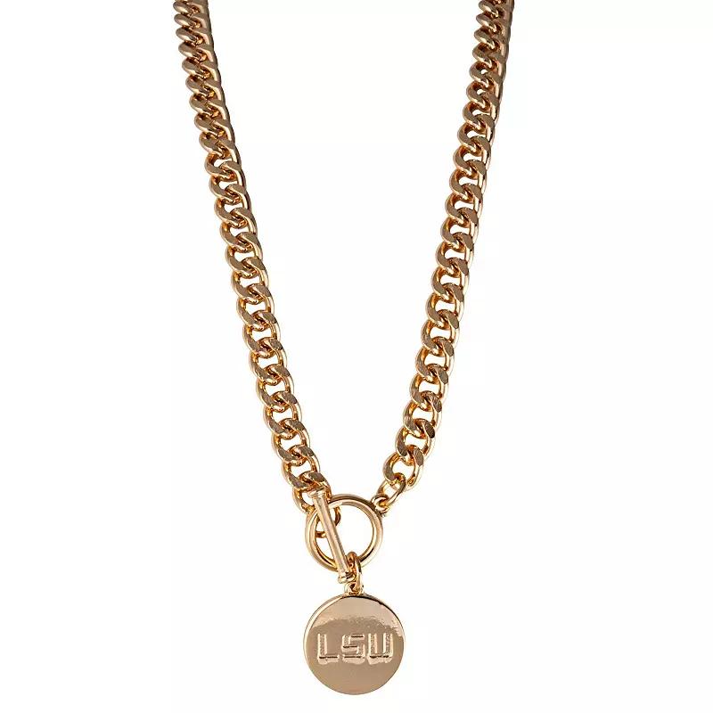 Give your LSU Tigers accessories a boost with this Ramsey necklace. With its crisp team graphics and dazzling gold material, this elegant necklace can be worn with any game day outfit to accentuate your LSU Tigers fandom even further, or whenever you need an extra dose of fan pride.Give your LSU Tigers accessories a boost with this Ramsey necklace. With its crisp team graphics and dazzling gold material, this elegant necklace can be worn with any game day outfit to accentuate your LSU Tigers fandom even further, or whenever you need an extra dose of fan pride.PRODUCT FEATURESMaterial: 100% Stainless SteelEngraved graphicsOfficially licensedWipe clean with a damp clothNecklace drop length measures approx. 9Toggle clasp T-Bar closureBrand: Emerson StreetImportedCharm measures approx. .50 in diameter Size: One Size. Gender: female. Age Group: adult.