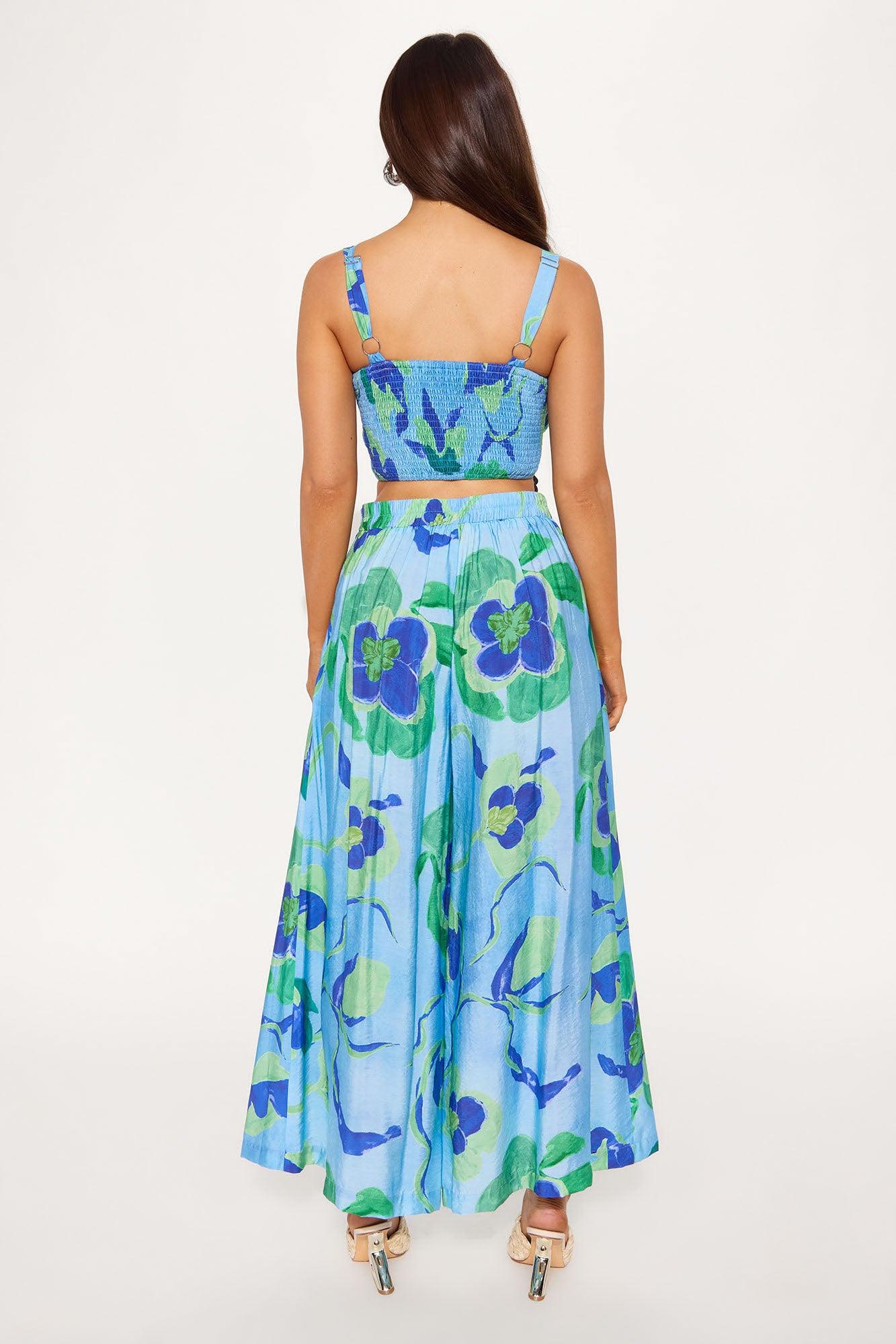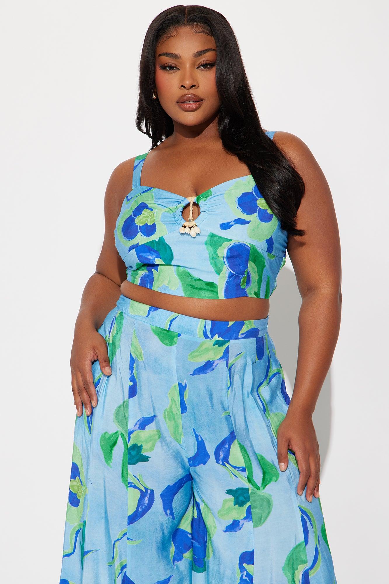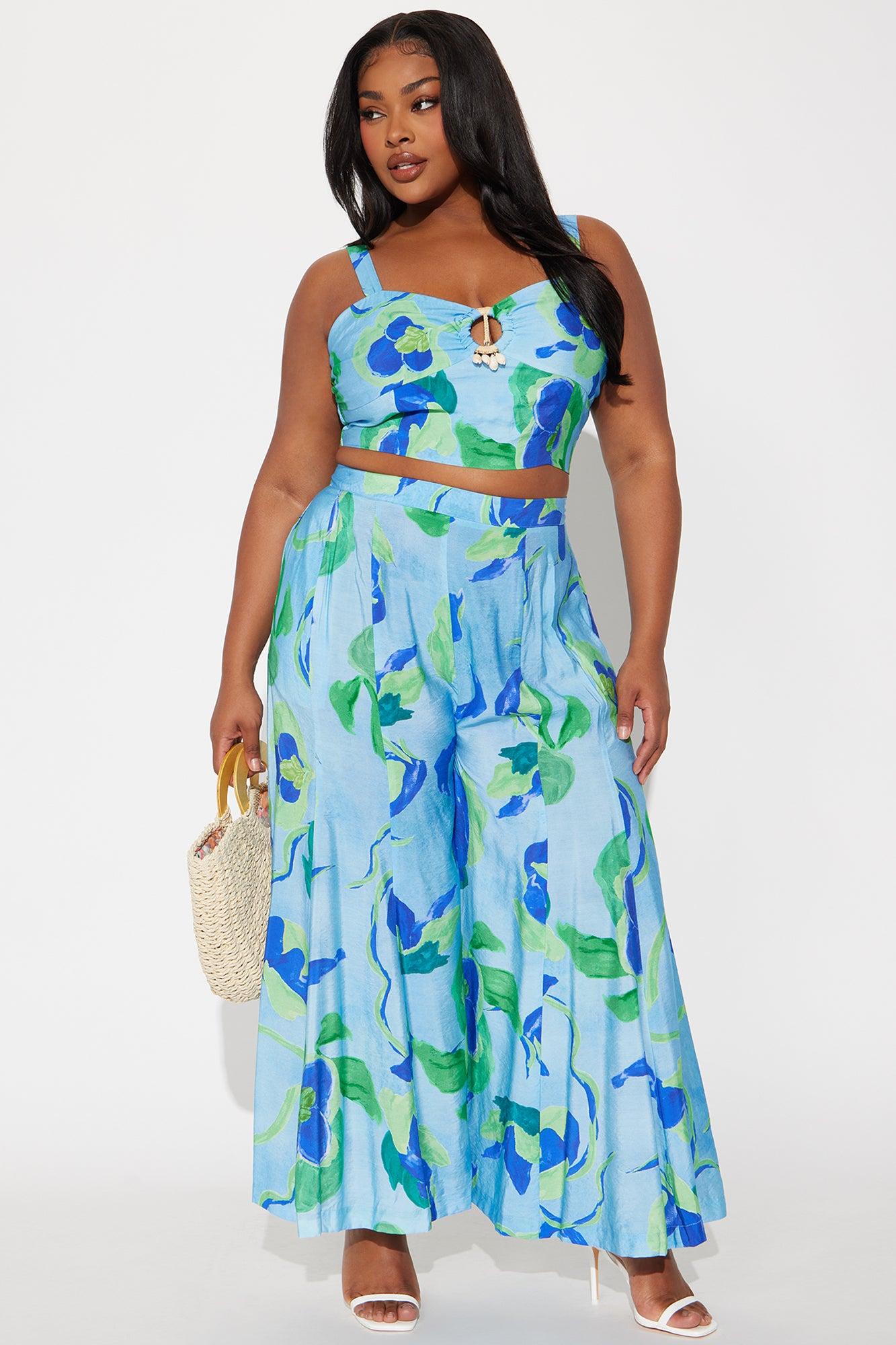 Available In Blue. Floral Top And Wide Leg Pant Set Non Stretch Adjustable Straps Smocked Back Invisible Side Zipper Back Elastic Waistband 25" Length Disclaimer: Print Placement Will Vary Self: 80% Nylon 20% Polyester Lining: 100% Polyester Imported California Proposition 65 WARNING: Cancer and Reproductive Harm - www.P65Warnings.ca.gov.