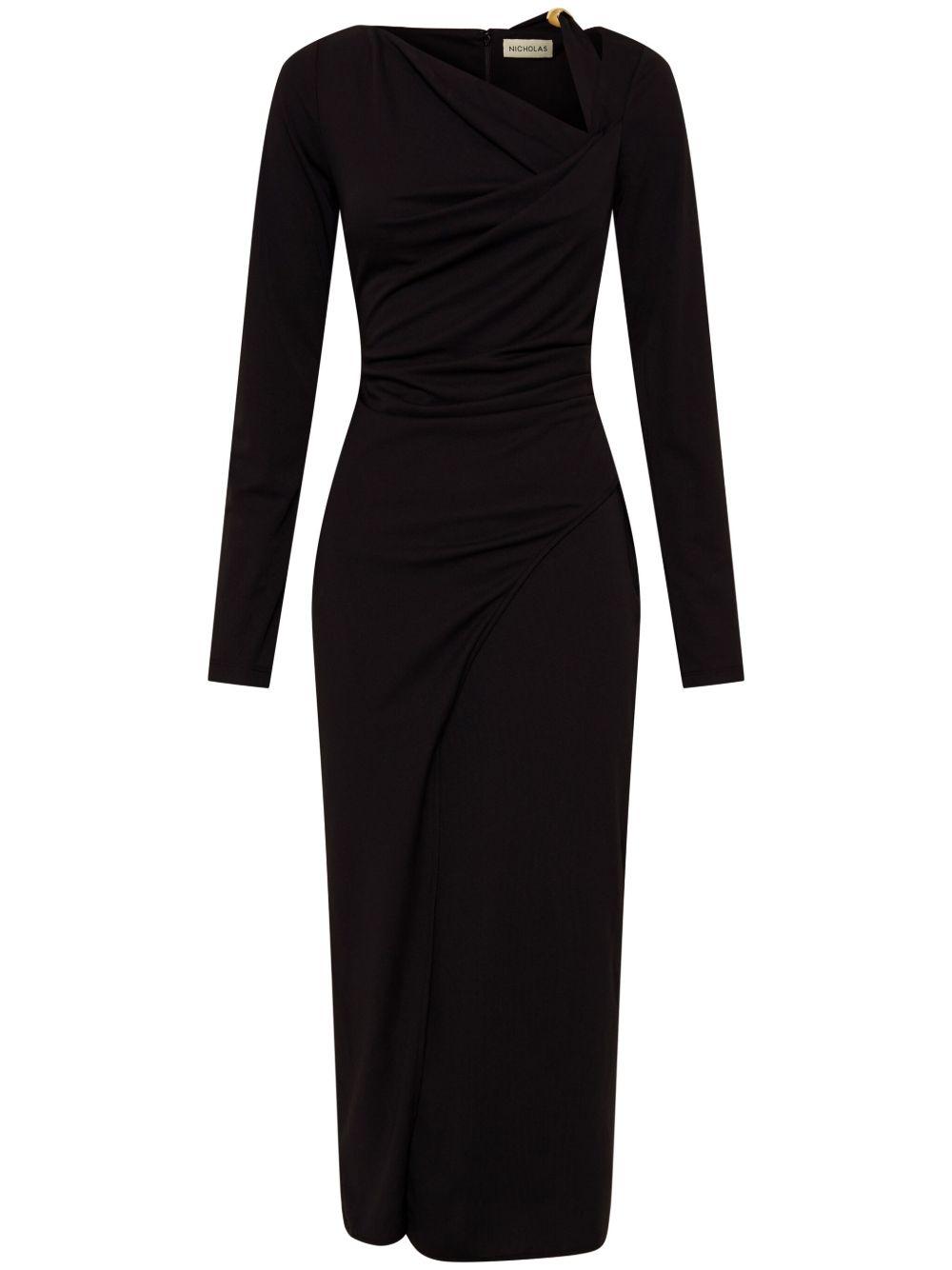 Nicholas Luca dress | Black | black | wrap design | concealed side zip fastening | asymmetric neck | long sleeves | gold-tone hardware | partial lining | front slit | straight hem | mid-calf length | Polyester/Spandex/Elastane | Cocktail & Party Dresses | Dresses | Clothing | Women
