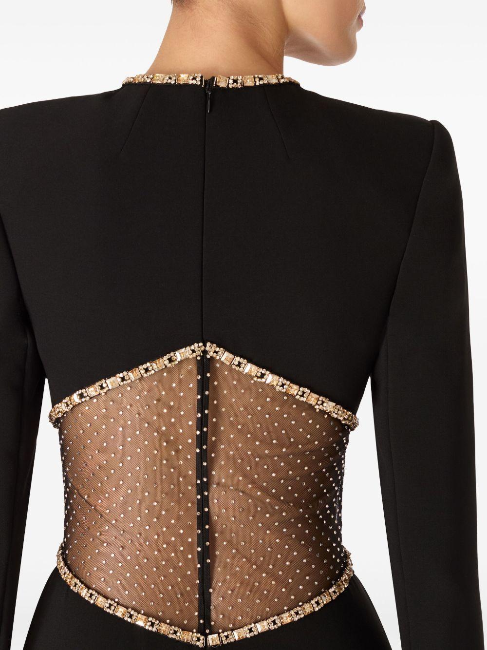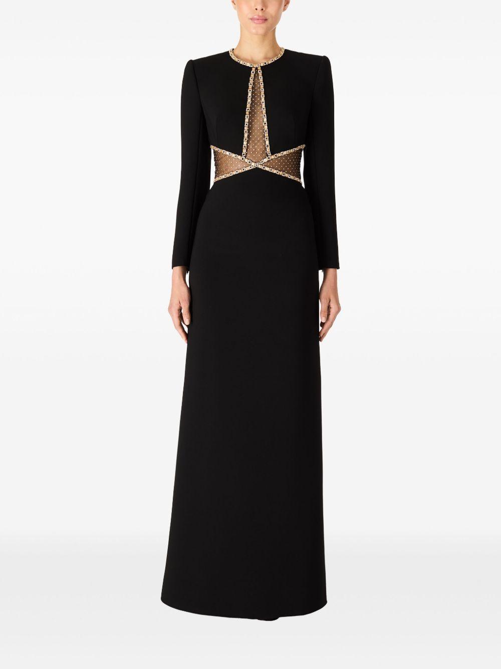 Jenny Packham Luca gown | Black | black | panelled design | sheer panels | concealed rear zip fastening | round neck | long sleeves | crystal embellishment | rhinestone embellishment | A-line skirt | straight hem | floor-length | Polyester | Evening Dresses | Dresses | Clothing | Women